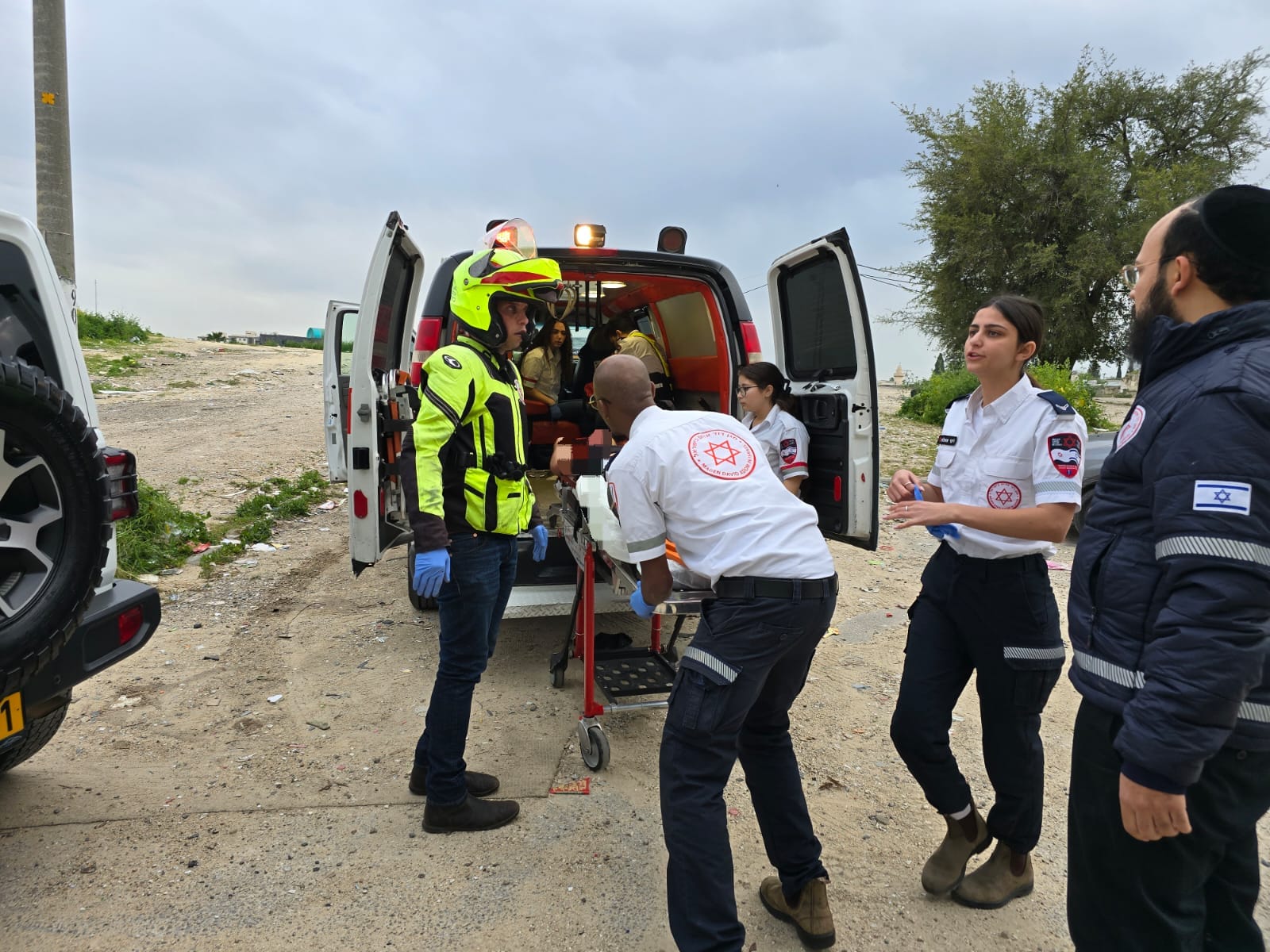 "הפצוע שכב על הרצפה כשהוא מעורפל הכרה וסבל מחבלת ראש קשה מאוד. הענקנו לו טיפול רפואי מציל חיים שכלל עצירת דימומים הרדמה והנשמה ופינינו אותו בניידת טיפול נמרץ של מד"א לבית החולים כשמצבו קשה".