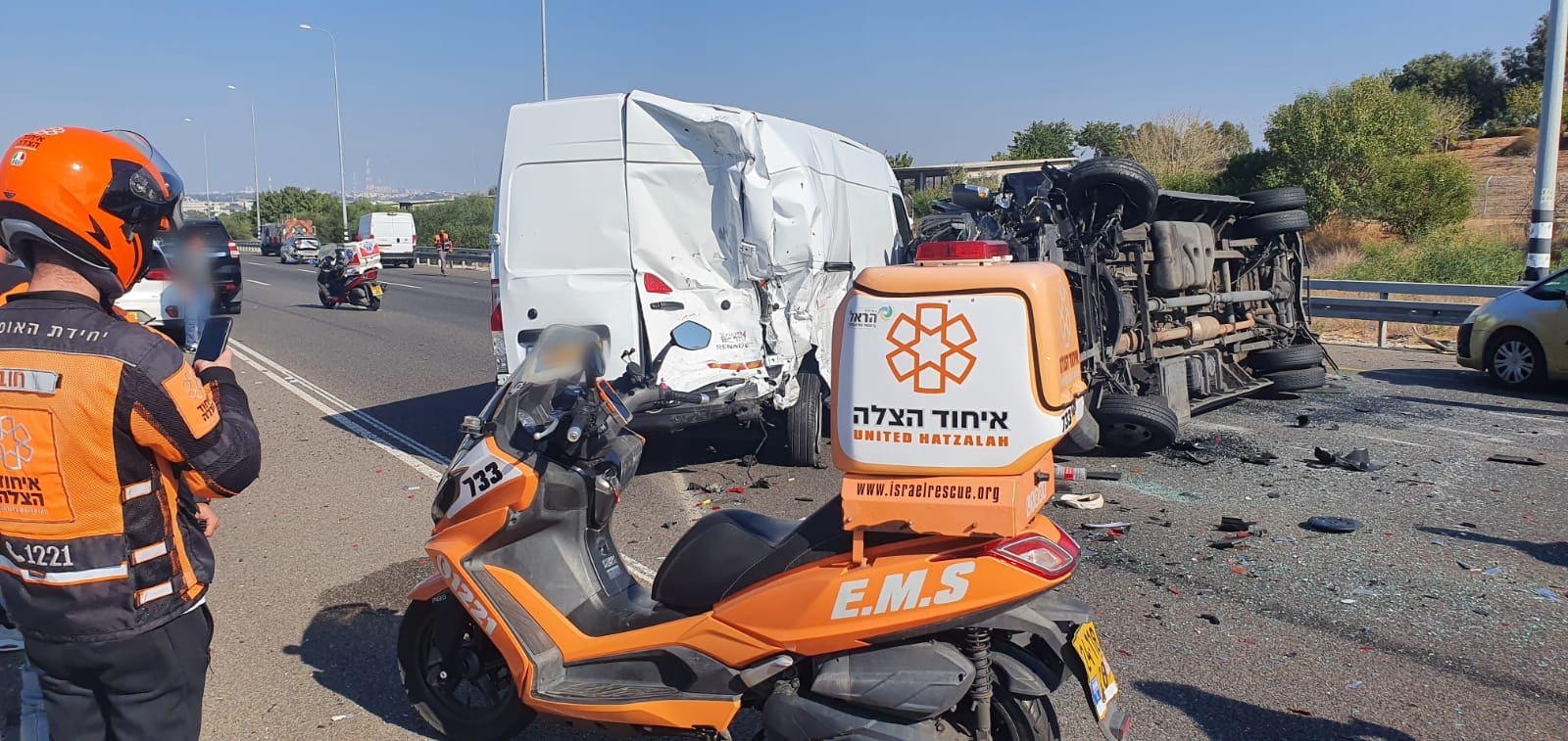 סאלי יהוד נהג אמבולנס של איחוד הצלה מסר: "עומסי תנועה נוצרו עקב אופי התאונה. לאחר הסיוע הראשוני בזירה אחד הפצועים במצב קל התפנה איתנו באמבולנס איחוד הצלה למרכז הרפואי אסותא באשדוד".