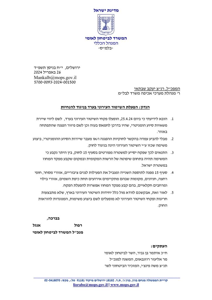 ״לאור זאת״, חתם אנגל, ״אבקשכם לוודא מול כלל יחידות השיטור העירוני בארץ שלא מתבצעות חריגות ופקחי השיטור העירוני לא מופעלים לשם ביצוע משימות המנוגדות להוראות החוק״.