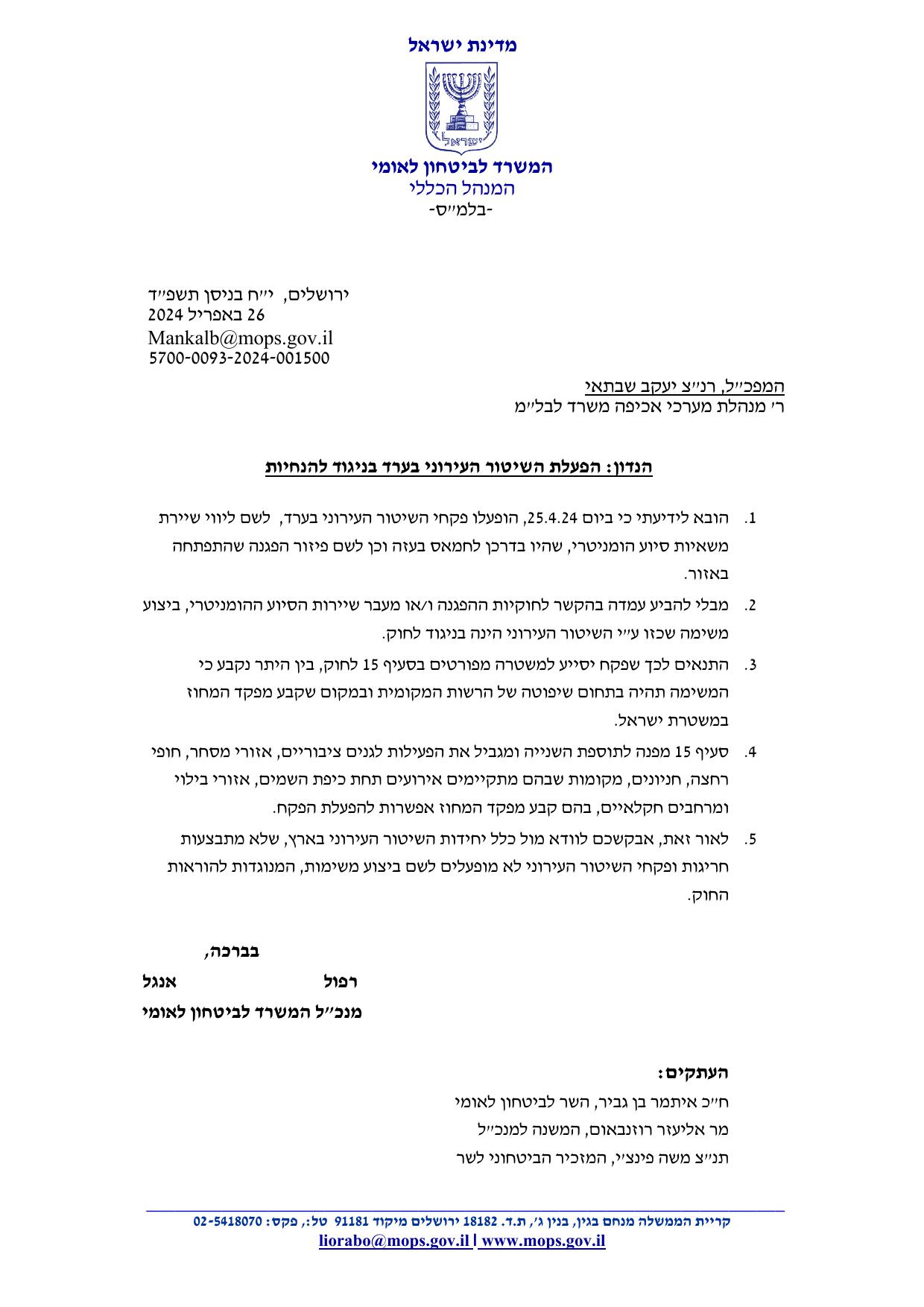אנגל פתח את מכתבו: ״הובא לידיעתנו כי ביום 25.4.24 הופעלו פקחי השיטור העירוני בערד לשם ליווי שיירת משאיות סיוע הומניטרי שהיו בדרכם לחמאס בעזה וכן לשם פיזור הפגנה שהתפתחה באזור״.