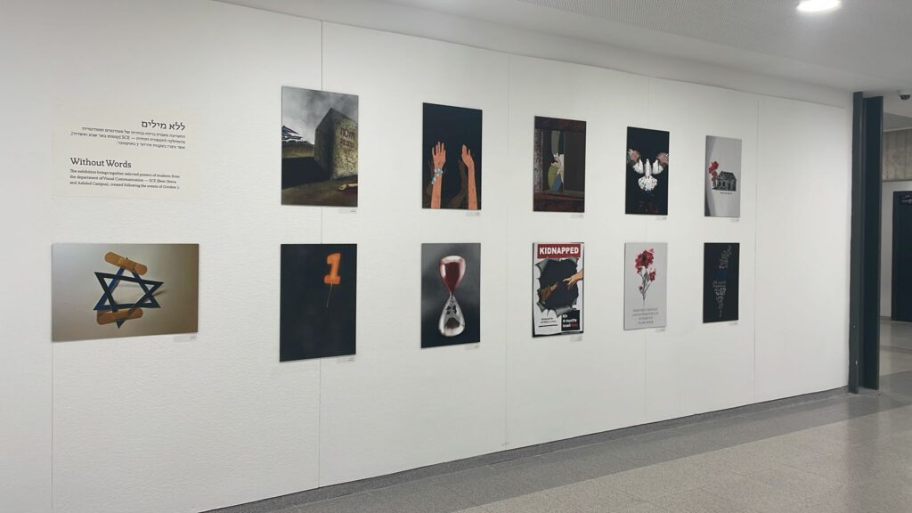 סטודנטים וסטודנטיות מהמחלקה לתקשורת חזותית ב-SCE המכללה האקדמית להנדסה ע"ש סמי שמעון, עיצבו כרזות בעקבות אירועי ה-7 באוקטובר בתערוכה הפתוחה לקהל הרחב ומוצגת בקמפוס תחת השם "ללא מילים".