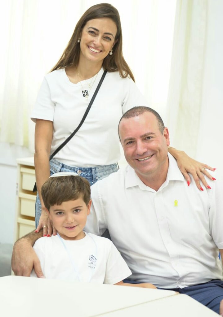 בתמונה: ראש העיר רחובות מתן דיל ואשתו אפרת מלווים את בנם עברי העולה לכיתה א' בבי"ס בראשית בעיר