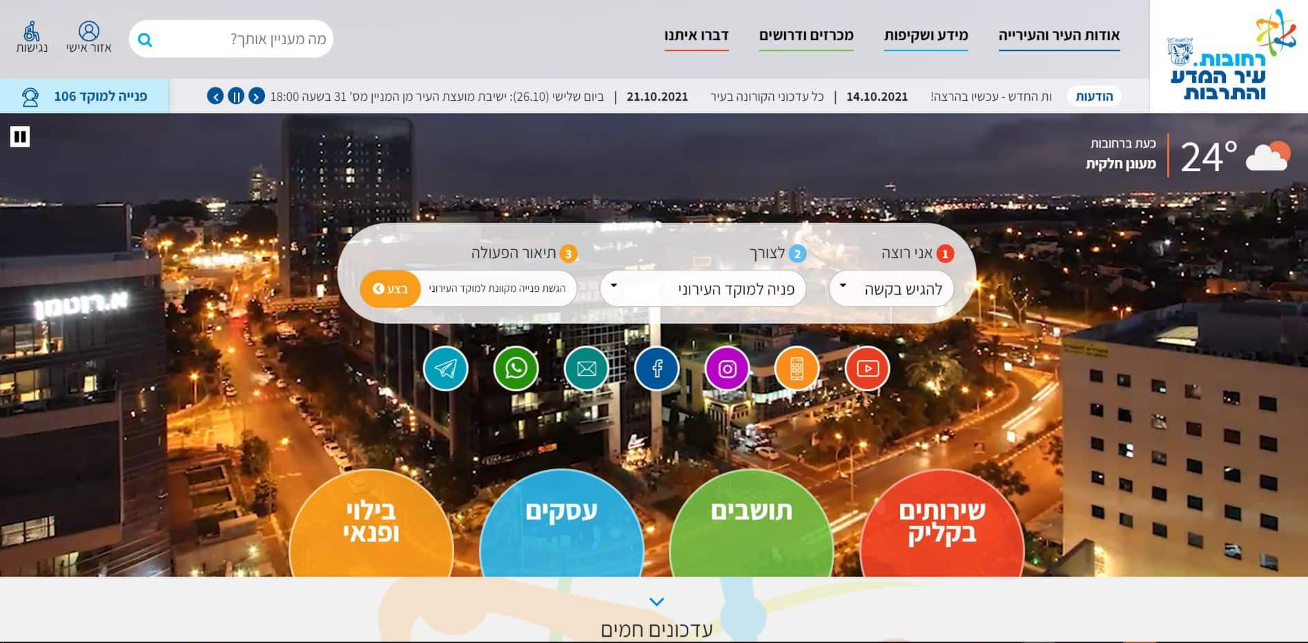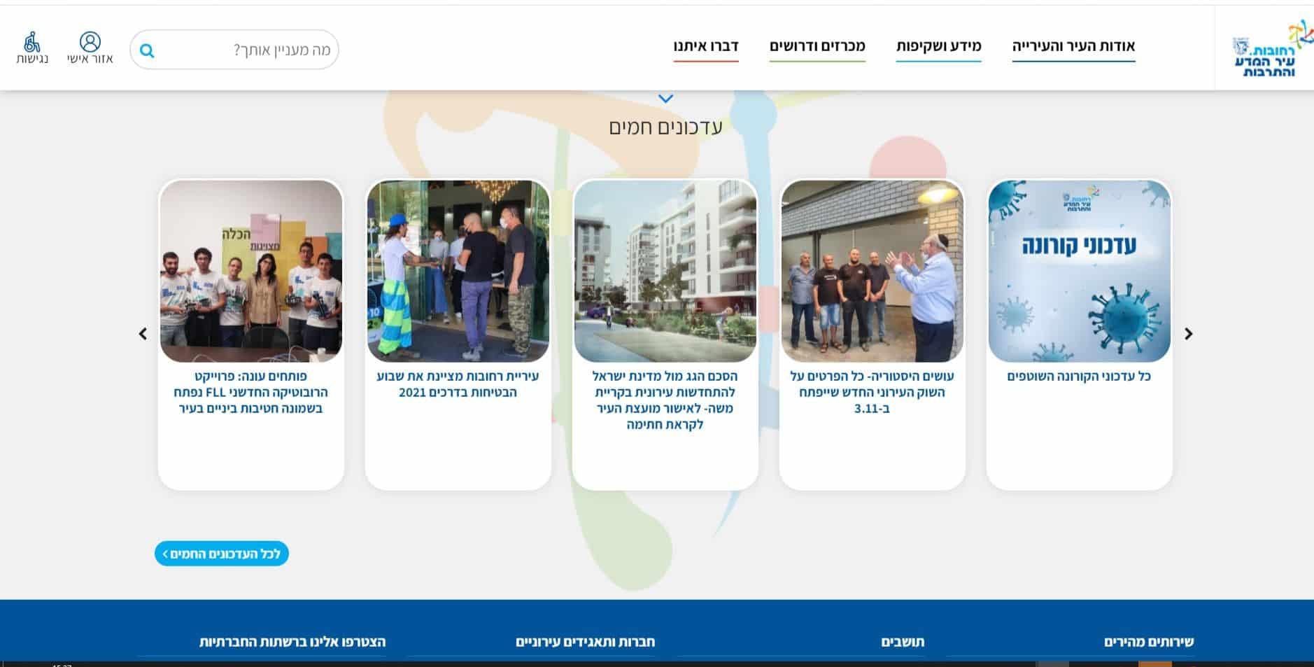 לאחר עבודה ממושכת, אגף הדוברות וההסברה בעיריית רחובות בשיתוף אגף מערכות מידע משיקים את אתר העירייה החדש. מדובר באתר חדשני ושירותי יותר מהאתר הקודם, נגיש לגלישה במובייל, אשר מאפשר לתושבים לקבל שירותים, להגיש בקשות, לבצע תשלומים ולקבל מידע נרחב על העיר והעירייה – בלחיצת כפתור, עם גישה מכל עמוד באתר.