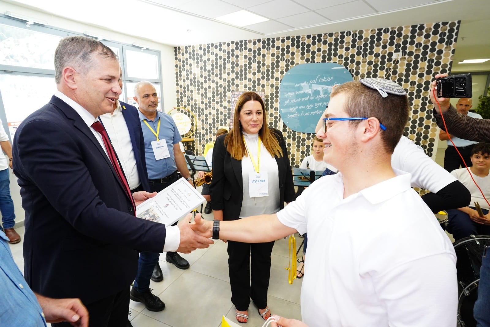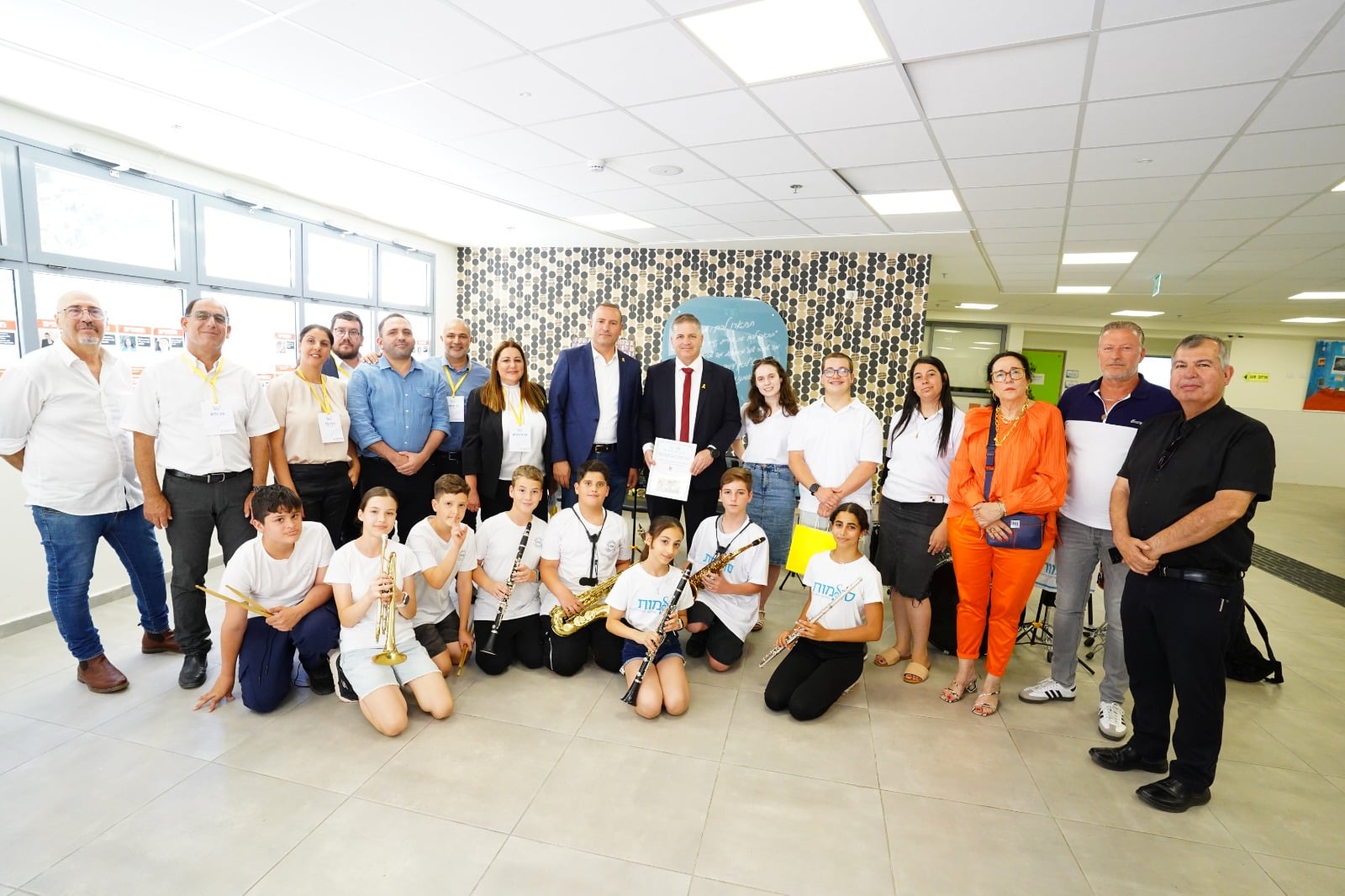 את השר והצוות המקצועי של משרד החינוך קיבלה תזמורת של תלמידות ותלמידי בית הספר שביט הלומדים בתכנית "סולמות" שניגנו מחרוזת שירי אהבה ותקווה ישראליים בכלי נשיפה ומזכירות מועצת התלמידים העירונית.