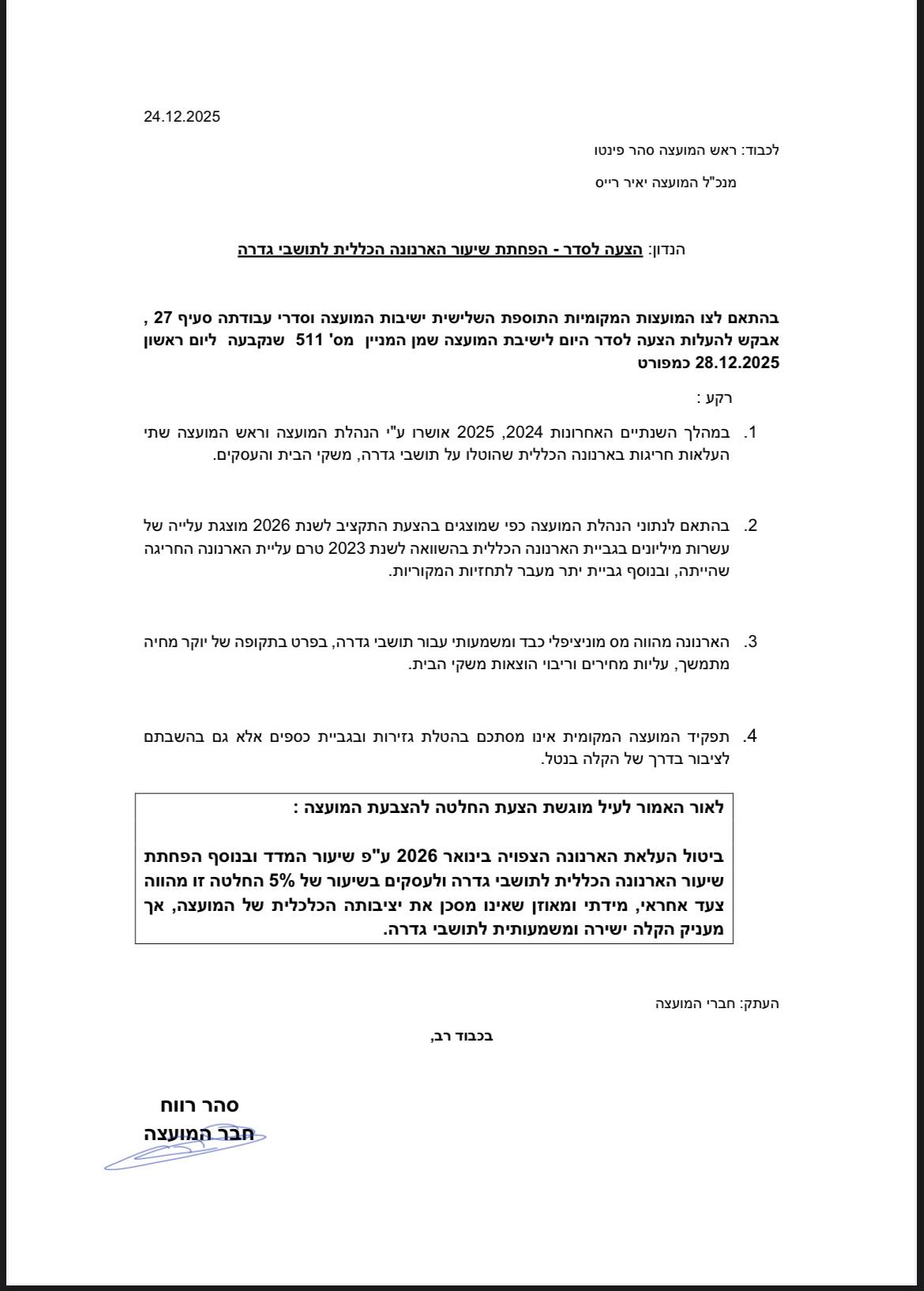 תושבי גדרה, לאחר שנתיים רצופות שבהן אישרה הנהלת המועצה העלאות ארנונה חריגות שהכבידו על הכיס של כולנו, הגיע הזמן לשינוי כיוון. בעוד יוקר המחיה ממשיך לטפס, נחשף כי הכנסות המועצה מארנונה צפויות לזנק בשנת 2026 בעשרות מיליוני שקלים לעומת שנת 2023. לנוכח נתונים אלו, הגשתי הצעה רשמית לסדר לקראת ישיבת המועצה הקרובה ב-28.12.2025.