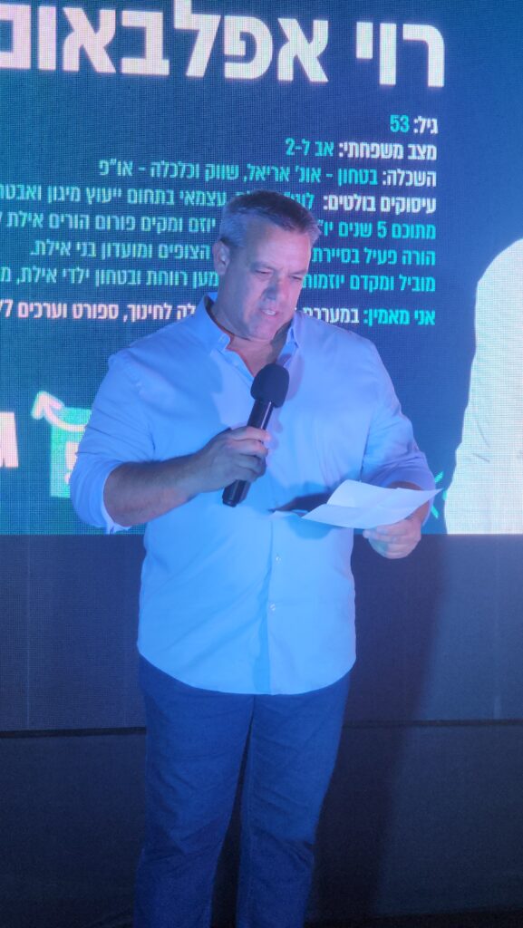 רוי אפלבוים -לוט"ר אילת, עצמאי בתחום ייעוץ ומיגון ואבטחה, 18 שנה בוועדי עובדים יזם והקים את פורום ההורים העירוני למען החייל; לדבריו, "במערכת שחושבת ומובילה לחינוך, ספורט וערכים 24/7".