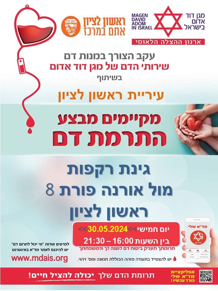 ביום חמישי, ה- 30.5.24, בין השעות 21:30-16:00, יתקיים אירוע התרמת דם, בשיתוף עם מגן דוד אדום, בגינת רקפות, מול רח' אורנה פורת 8.