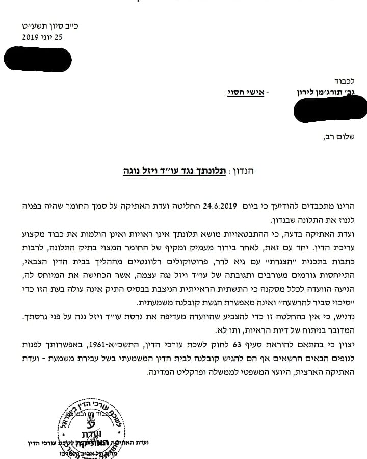 "החלטת הוועדה, "לאחר בירור מעמיק ומקיף של החומר"- במירכאות ובלעדיהן- בהירה ונחרצת ואינה מותירה ולו גם סדק דק לספק". אני רק יכולה לשער מה הניע אותך להגיש נגדי תלונה, אבל אין לי עדות או ראיות לבסס עליהן את השערתי (ככל הנראה בור לרר הוא היוזם והראיה שהתלונה נשלחה ממשרדי רשת ). עם זאת, גניזת התלונה יכולה לחזק את תחושת הבטן שלי כי לא רדיפת צדק ונכונות להשקיע כל מאמץ אפשרי וכל משאב נדרש כדי לחשוף אותו היא זו שהניעה אותך אלא מניע, או מניעים לא ענייניים ושיקולים זרים.