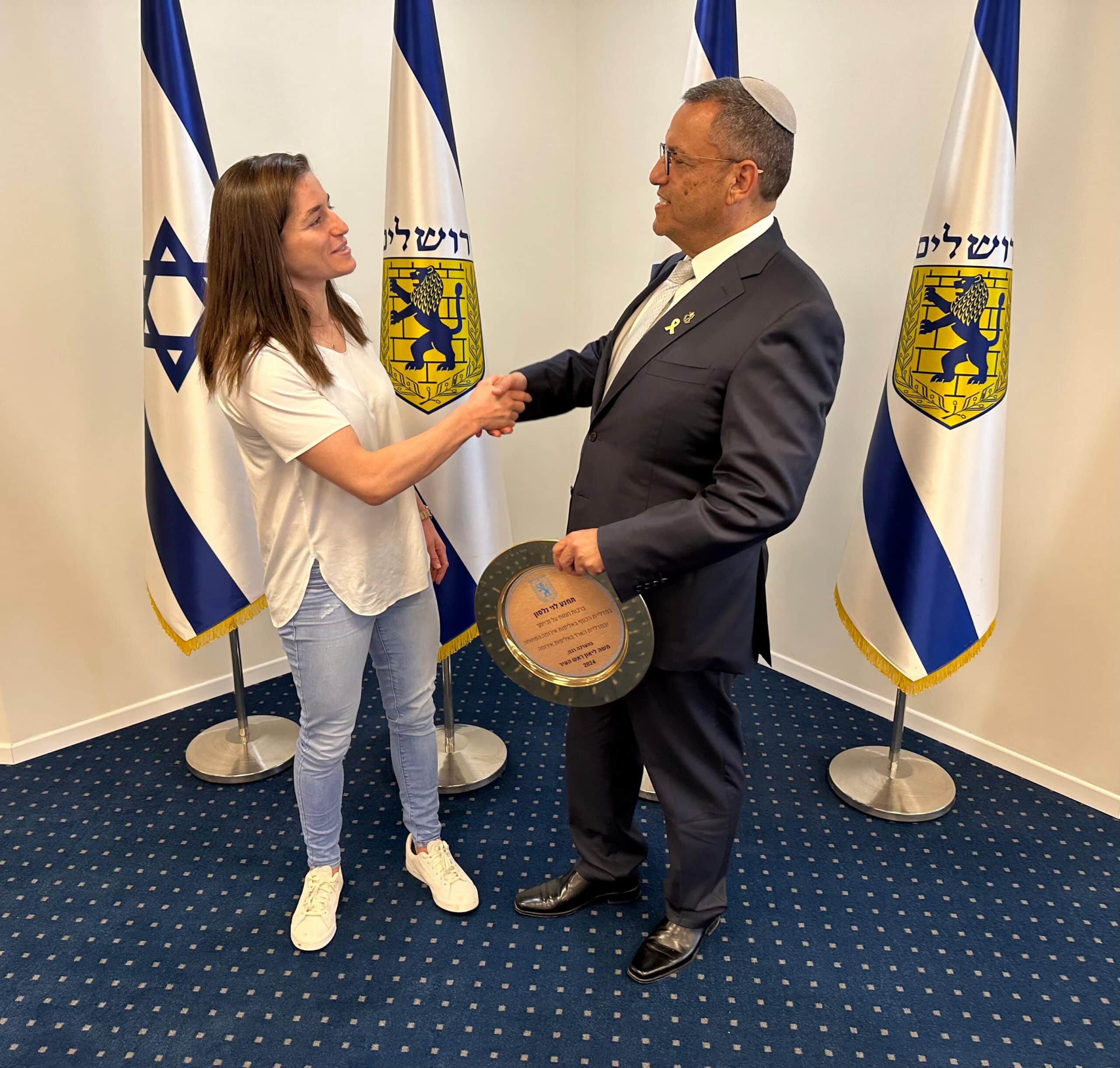 ראש העיר ירושלים אירח בלשכתו את זוכת מדליית הארד באליפות אירופה, תמנע נלסון-לוי והעניק לה אות הוקרה ומענק כספי על זכייתה