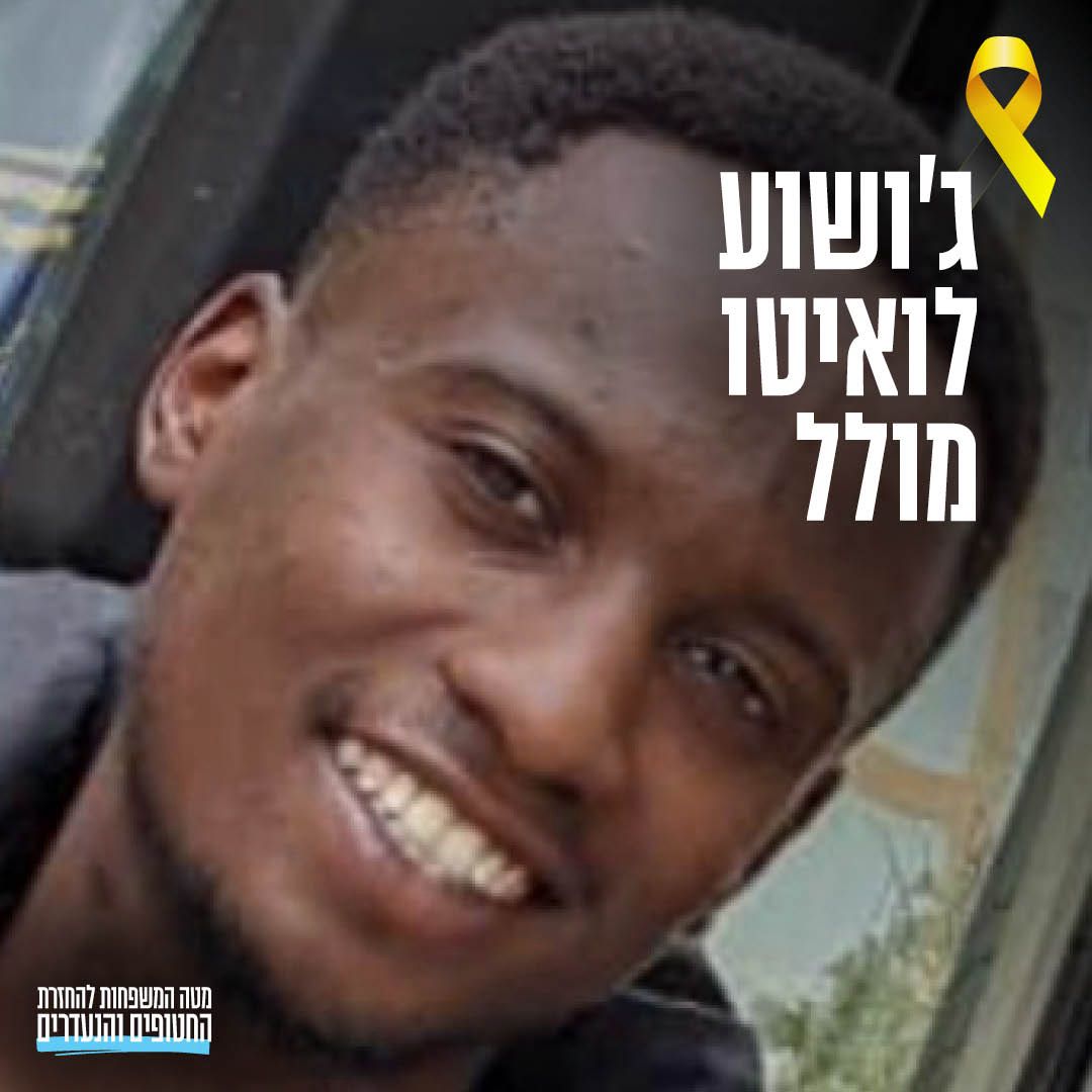 ג'ושוע לואיטו מולל ז״ל מטנזניה. ג'ושוע הגיע לקיבוץ נחל עוז 19 ימים בלבד לפני השבת השחורה, לאחר לימודי אגרונומיה באוניברסיטה. הוא תכנן ללמוד בישראל חקלאות מעשית, ולחזור למולדתו עם ארגז כלים רחב. בבוקר השבעה באוקטובר ג׳ושוע עבד ברפת של הקיבוץ, עם פרוץ המחבלים הוא נרצח ונחטף לעזה. משפחתו מספרת שהיה מנומס, אדיב, חרוץ מאוד, בעל חיוך גדול שלא יורד מהפנים. הוריו וארבעת אחיו גרים בטנזניה.