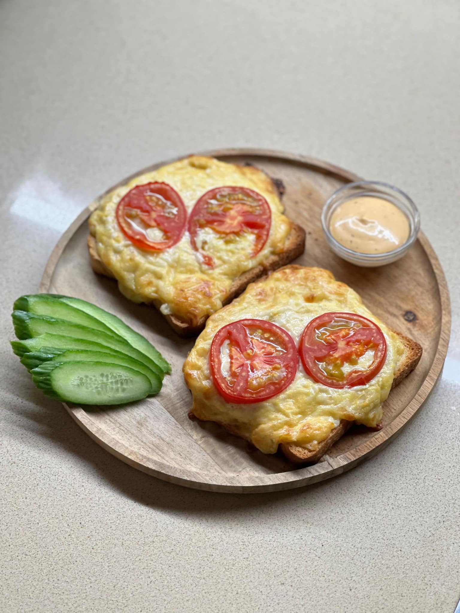 לגרד כמה סוגים גבינה בפומפייה, להוסיף ביצה 1, כפית חרדל, לערבב. למרוח על פרוסות לחם שכבה אחידה, פרוסות עגבניות ולתנור. חימום עליון. 180 מעלות., 15-20 דקות.