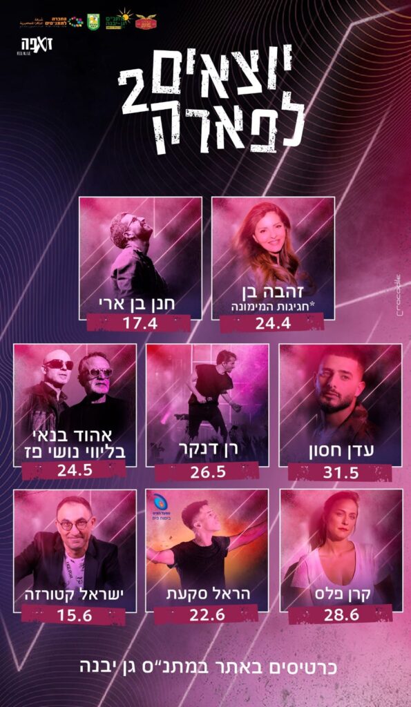 ראש מועצת גן יבנה מודה היום (שלישי) כי הגזים ביחד עם שותפיו לעשייה. לא, לא מדובר חלילה בעניין שלילי אלא דווקא בהופעות הענק במסגרת "יוצאים לפארק 2" שיתקיימו בגן יבנה עם שרשרת ארוכה של אומנים – מהטובים והמובילים בישראל – שיגיעו בזה אחר זה אל פארק 'רונה רמון' ביישוב. מי ברשימה?קרן פלס, חנן בן ארי, זהבה בן, הראל סקעת, אהוד בנאי ונושי פז, רן דנקר, עדן חסון, ישראל קטורזה והיד עוד נטויה…