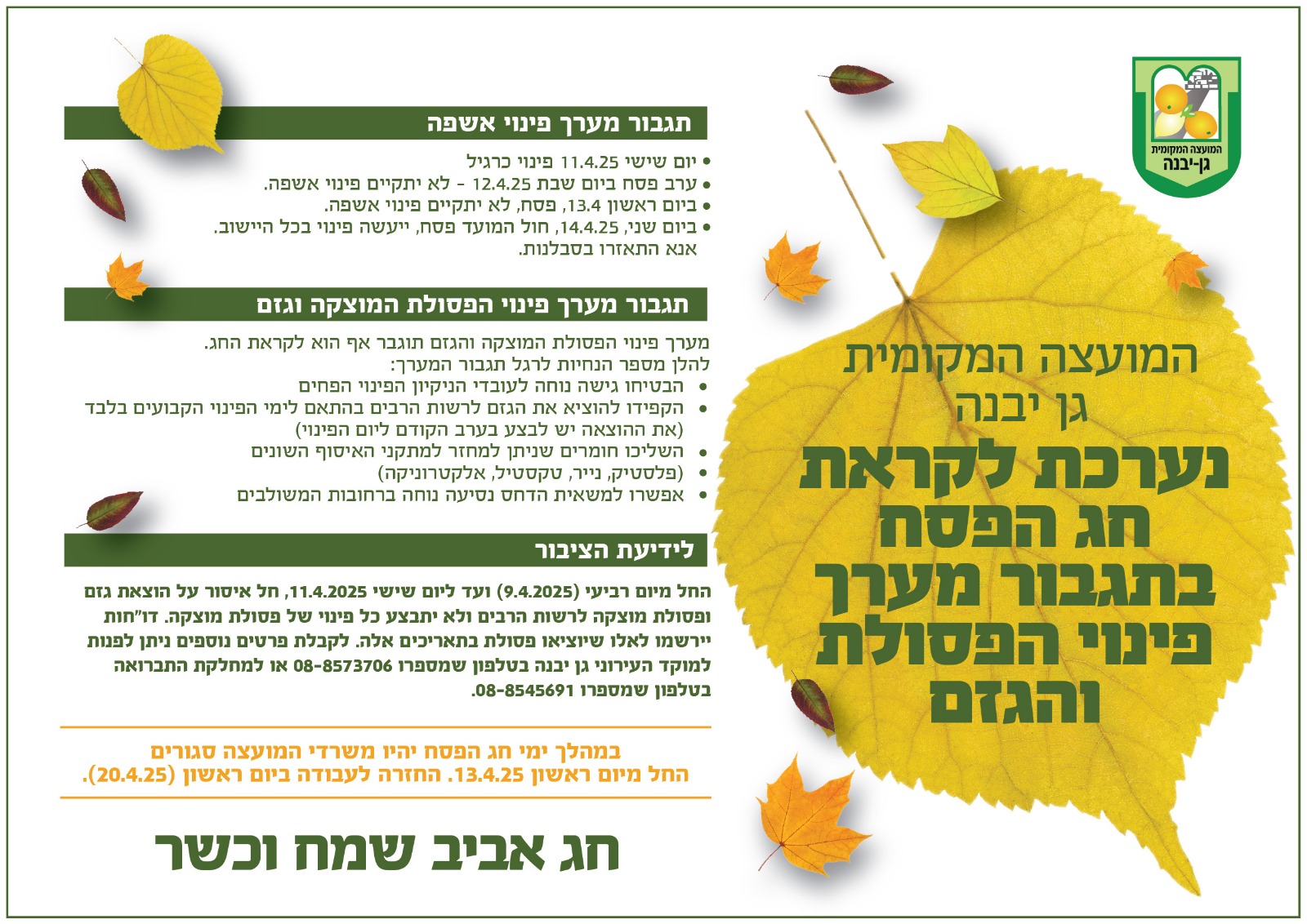 תושבים יקרים, לקראת חג הפסח הבא עלינו לטובה, אנא הקפידו על פינוי פסולת וגזם על פי ההנחיות.