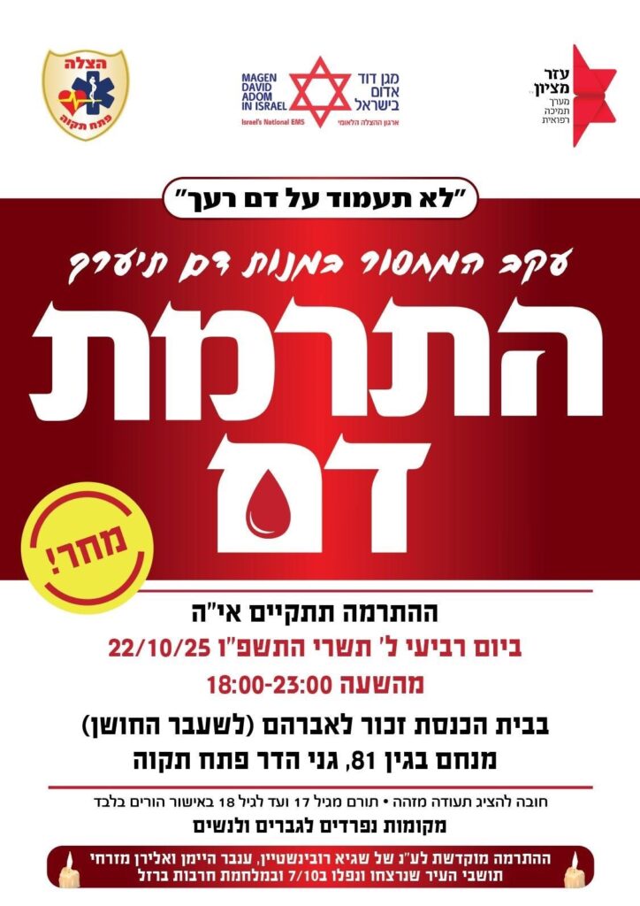 עקב המחסור החמור במנות דם, מד"א הצלה פתח תקווה, ארגון "עזר מציון" ושירותי הדם של מד״א, קוראים לציבור להגיע, לתרום דם ולהציל חיים בהתרמת הדם המסורתית והמיוחדת שנערכת פעמיים בשנה, אחרי סוכות ואחרי פסח, לצורך שימור מלאי הדם הנדרש לשגרה ולחירום. ההתרמה תתבצע מחר (רביעי) ל' בתשרי תשפ"ו, 22.10.25 בבית הכנסת זכור לאברהם (לשעבר החושן), ברחוב מנחם בגין 81, הדר גנים, פתח תקווה, ותיערך מהשעה 18:00 ועד ל-23:00.
