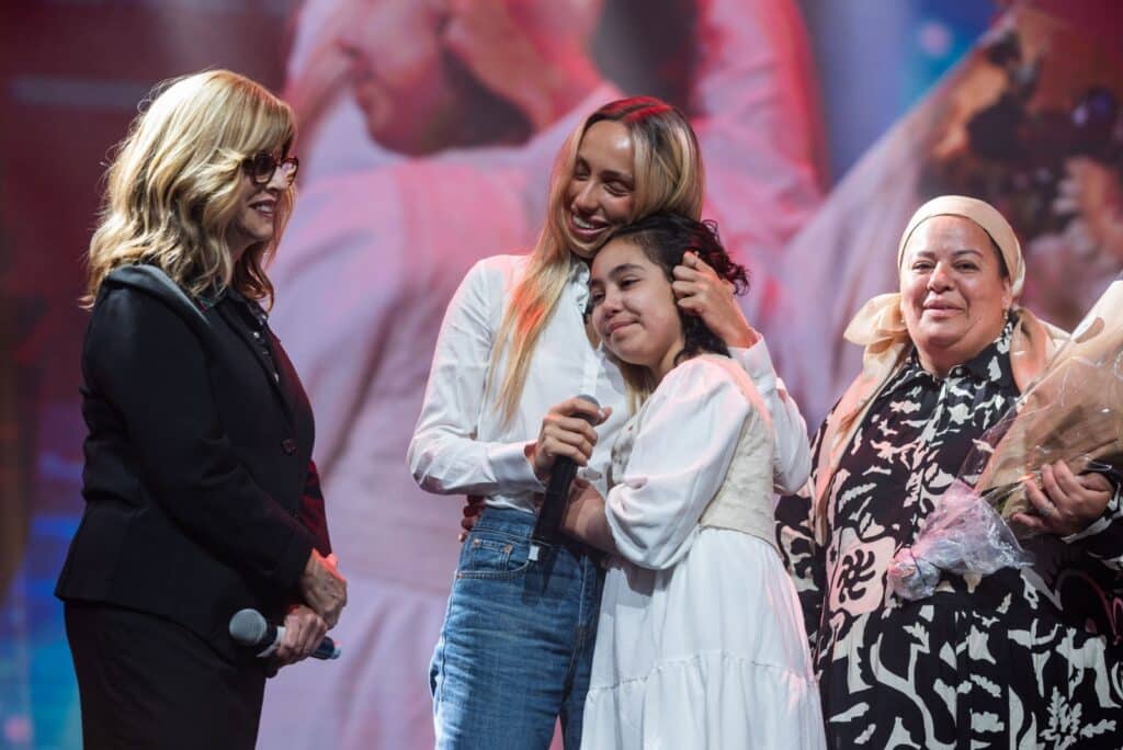 טליה הבריאה וכעת הן נפגשו לראשונה באירוע מיוחד של עמותת "עזר מציון" מול 3000 צעירות מתנדבות העמותה.