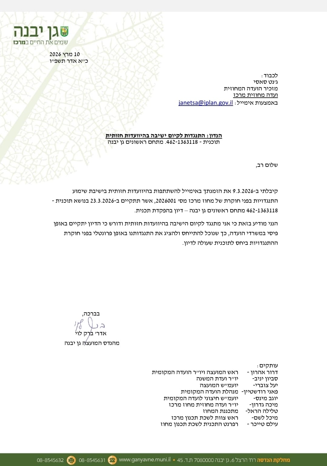 המאבק של מועצת גן יבנה נגד התוכנית במתחם "הראשונים" (תוכנית 462-1363118) עולה מדרגה. בעקבות זימונים שקיבלו תושבים לחקירת התנגדויותיהם באופן מקוון, שיגר מהנדס המועצה, אדרי ברק לוי, מכתב רשמי למזכיר ועדת המשנה של הוועדה המחוזית מרכז.