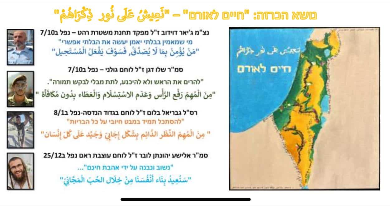 על גבי מפת ארץ ישראל בוצעו קרעים כפערים שנוצרו בחברה ונתפרו בחוט כחול כסמל לשאיפה לאיחוי ולאחדות בעם , הפרחים והעלים המבצבצים מבין הקרעים המסמלים פריחה ותקומה . בכרזה שזורים אמרות לוחמים אשר נפלו במלחמת ״חרבות ברזל״ המביעים אהבת חינם , סולידריות סובלנות ,ערכים אשר חיו לאורם ואנו כחברה מחוייבים לצוואתם ככותרת הכרזה חיים לאורם: ״نعيش على نور ذكراهم"