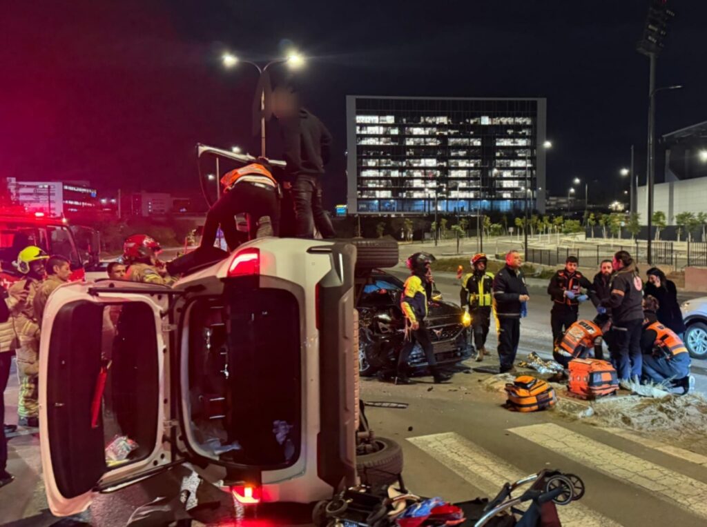דרמה לילית ברחובות: רכב התהפך בדרך מנחם בגין, ארבעה נפגעים פונו לקפלן