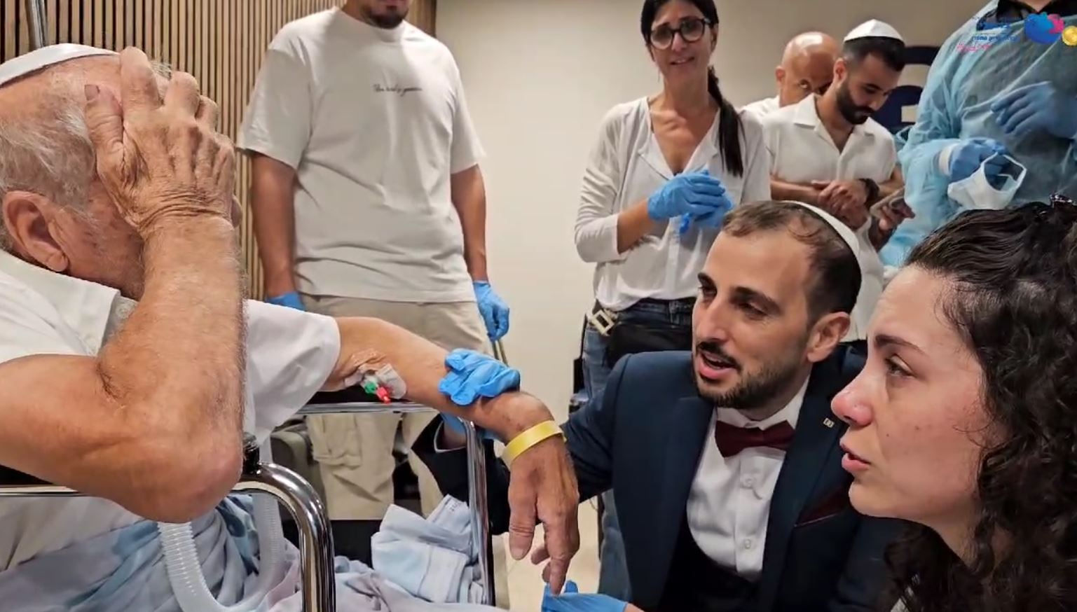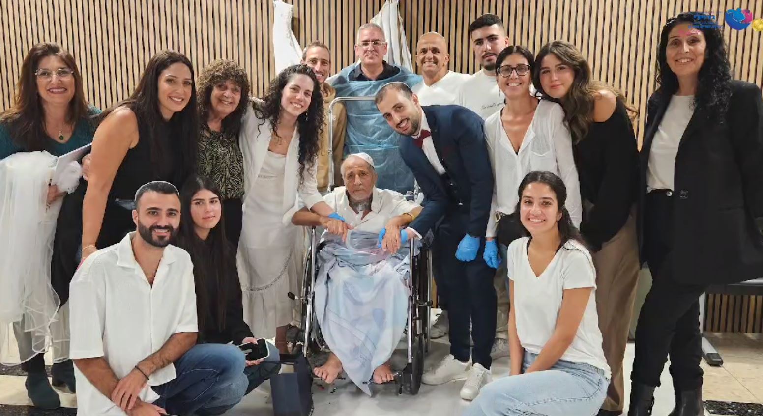 האבא, מטופל במחלקה פנימית ב', ראה כיצד חלומו מתגשם כשנוכח בחתונת בנו דוד עם בת זוגתו שרה הודות לשיתוף הפעולה של צוות בית החולים עם עמותת ושמחת.