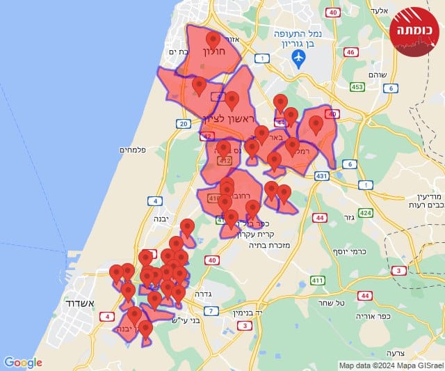 בין הישובים שבהם נשמעו אזעקות: רחובות, באר יעקב, ישרש, רמלה, נצר סרני, סתריה, גיבתון, גן שלמה, נס ציונה, לוד, ניר צבי, ראשון לציון – מזרח ומערב, תעשיון צריפין, גבעת ברנר, חולון, בית גמליאל, בניה, כפר מרדכי, שדמה, משגב דב, עשרת, גבעת וושינגטון, קבוצת יבנה.