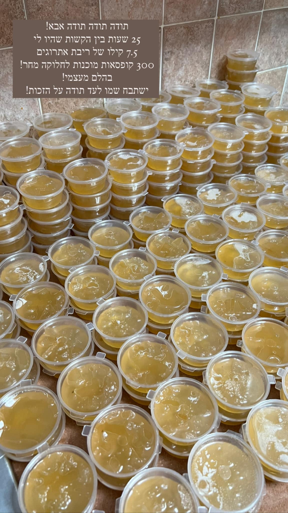 "את הריבה התחלתי להכין כשהייתי בהריון של הגדולה שלי, קראתי את הסגולות של האתרוג והכנתי כמות יחסית קטנה. פרסמתי שאני מציעה את הריבה לסגולות האלה וראיתי שיש ביקוש, אז הכנתי שוב כמות, חילקתי באהבה וראיתי ישועות! נשים נקלטו להריון, נשים שחיכו שנים! לי ספציפית היו לי לידות מהאגדות! וככה כל שנה אני אוספת מעל ל-100 אתרוגים מבורכים, מכינה במשך יממה שלמה או קצת יותר את הריבה וברוך ה' יש רק ישועות. כמובן שיש לי הודעות מוכחות מנשים שעדכנו אותי שנקלטו להריונות, נשים ששלחו תמונות של הילדים ועוד".