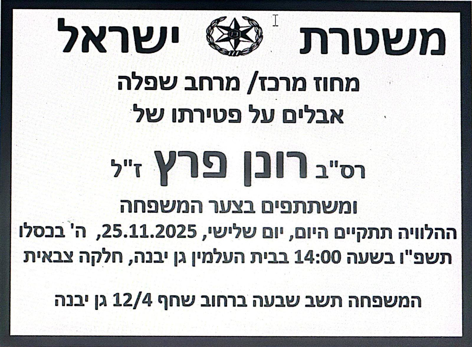 בכאב עמוק נפרדו היום רבים מרס"ב רונן פרץ ז"ל, ששימש כשוטר הקהילתי של יבנה במשך שנים רבות. פרץ ז"ל, אשר הובא למנוחות בחלקה הצבאית בגן יבנה – בה התגורר, הותיר אחריו מורשת של אנושיות יוצאת דופן ולב גדול.
