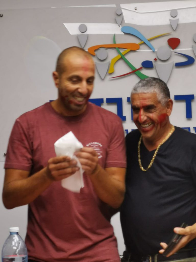 אלא שרגע לפני החגיגות נראה מדהלה כשפניו מדממות, אולם מהר מאוד הבינו הנוכחים כי גדי עוקשי, חברו של מדהלה ומהאנשים המצחיקים ברחובות, צבע את פניו באודם בגוון אדום. מדהלה ההמום, הידוע בחיבתו להומור, "זרם" כמובן עם השיגעון של עוקשי, הנוכחים צחקו, שוקרי ועוקשי היו אמונים על הקטע האומנותי ומלול והצוות של מדהלה על הברכות. שיהיה במזל טוב!