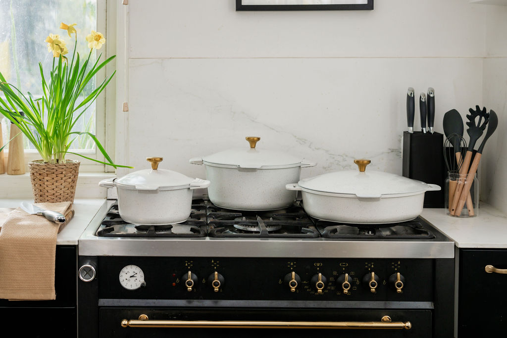 לצדה, בולטת גם סדרת Caserola בעיצובו של השף אסף גרניט, המגיעה בגוון קרם אקסקלוסיבי ומשלבת מראה נורדי עם טכנולוגיה מתקדמת. בזכות גוף קל מיציקת אלומיניום, החום מתפזר במהירות ובאופן אחיד, והתוצאה – בישול יעיל, בריא וטעים יותר. המכסה החדשני שומר על עסיסיות, ומתפקד גם כבסיס הגשה אלגנטי – ישירות מהכיריים אל מרכז שולחן החג.