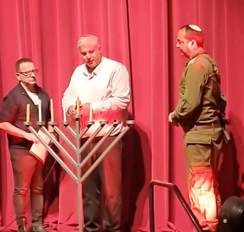 בפתיחת המופע הדליק משה וידר, תושב העיר שמשרת בעוטף עזה יחד עם סגן ראש העיר אמיתי כהן את הנר החמישי של חנוכה שהוקדש לחזרתם לשלום של כל המגוייסים והמגוייסות וכוחות הביטחון בעיר.
