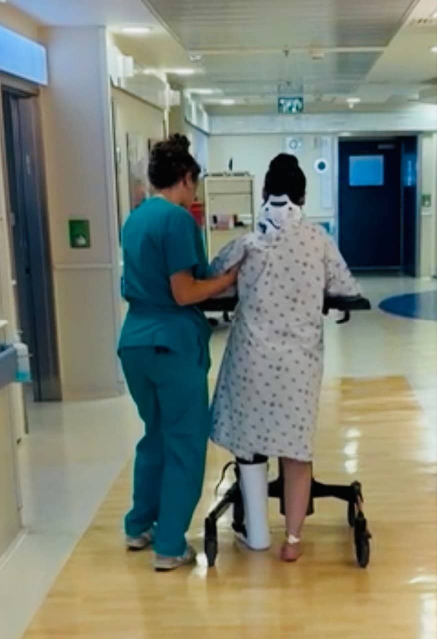 מספר ימים לאחר הניתוח ע' מראה סימני התאוששות טובים וכבר מניעה את רגליה ומתהלכת באיטיות – אך בנחישות, במסדרונות המחלקה בסיוע הצוות התומך בה.