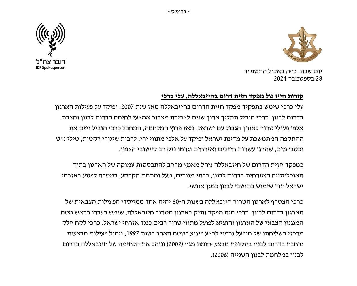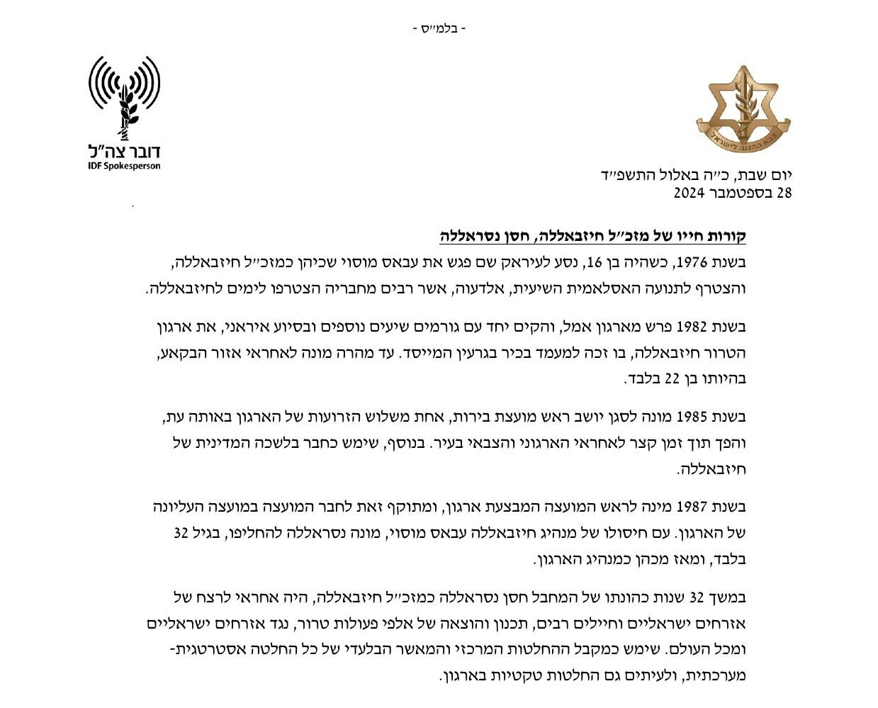 דובר צה״ל מודיע כי אתמול (ו׳), צה״ל חיסל את חסן נסראללה, מנהיג ארגון הטרור חיזבאללה וממייסדיו, ויחד איתו את עלי כרכי, מפקד חזית הדרום בחיזבאללה, ומפקדים נוספים בחיזבאללה.