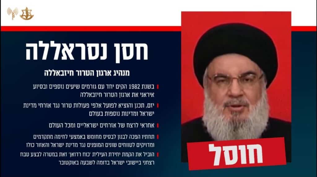 במשך 32 שנות כהונתו של המחבל חסן נסראללה כמנהיג ארגון הטרור חיזבאללה, היה אחראי לרצח של אזרחים ישראליים וחיילים רבים, ולתכנון והוצאה לפועל של אלפי פעולות טרור נגד מדינת ישראל וברחבי העולם. נסראללה היה מקבל ההחלטות המרכזי והמאשר הבלעדי של החלטות אסטרטגיות-מערכתיות, ולעיתים גם החלטות טקטיות בארגון.