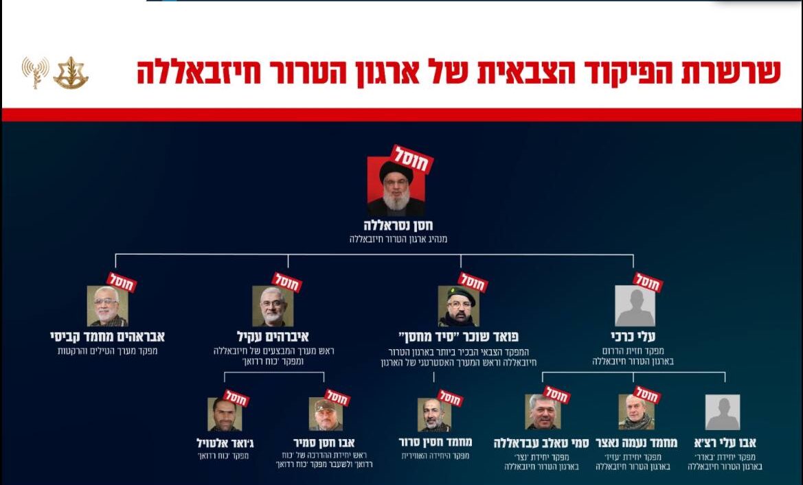 דובר צה״ל מודיע כי אתמול (ו׳), צה״ל חיסל את חסן נסראללה, מנהיג ארגון הטרור חיזבאללה וממייסדיו, ויחד איתו את עלי כרכי, מפקד חזית הדרום בחיזבאללה, ומפקדים נוספים בחיזבאללה.