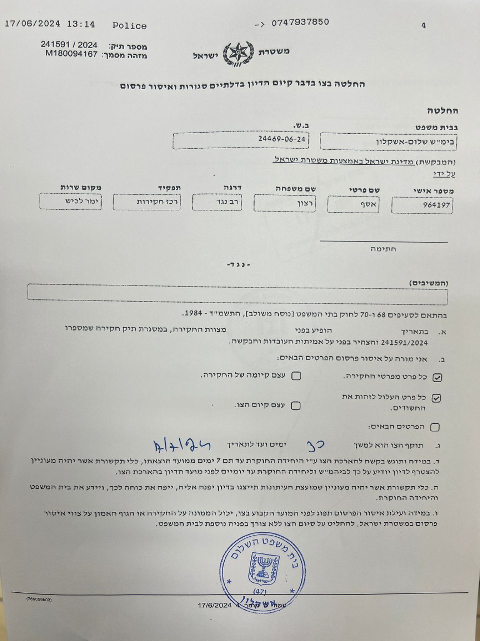 בית משפט השלום השלום האריך את צו איסור הפרסום, על פרטי חקירת הרצח שאירע באשקלון בתאריך 11.6.24, שמספרה 241591/2024.