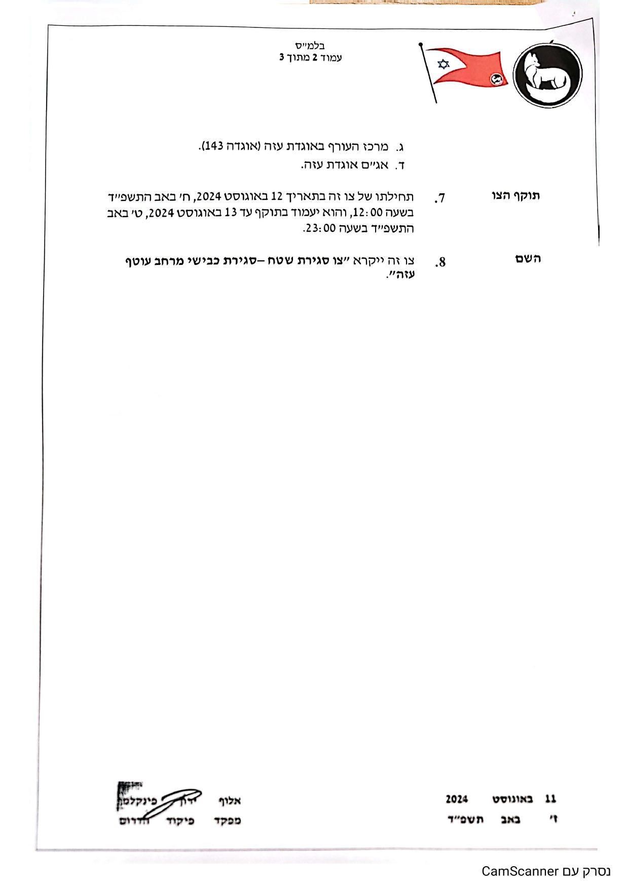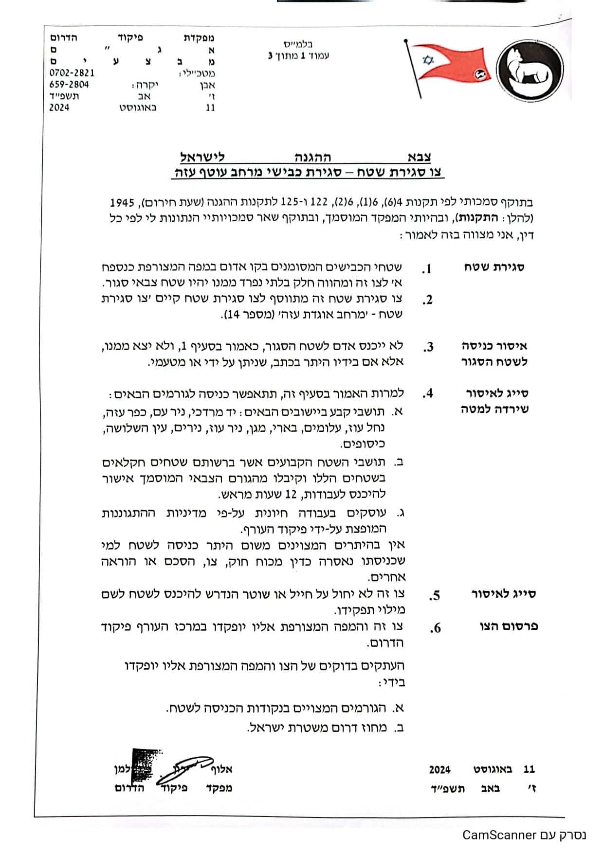 הצו ייכנס לתוקף היום, 12.08.2024, בשעה 12:00.