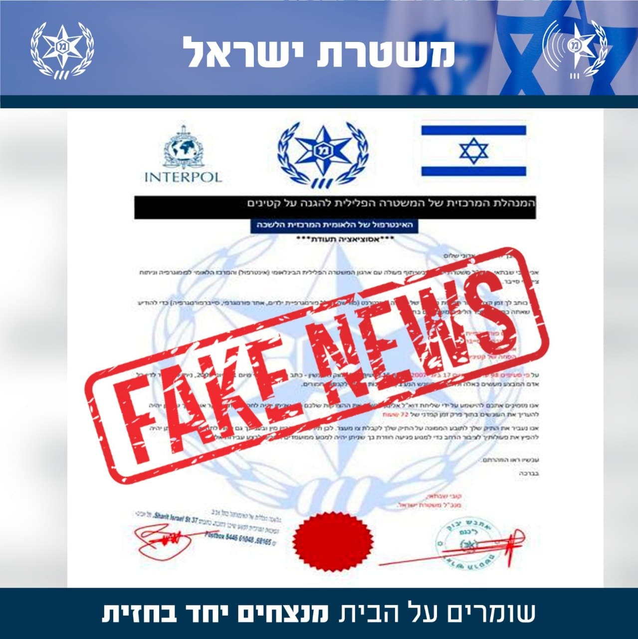 ממשטרת ישראל נמסר: בשעות האחרונות אנו עדים לדיווחים אודות אזרחים המקבלים הודעות אישיות הנחזות להודעות שנשלחו על ידי מפכ"ל המשטרה רב ניצב קובי שבתאי בהן מקבל ההודעה מוזמן לחקירה בחשד לביצוע עבירה: