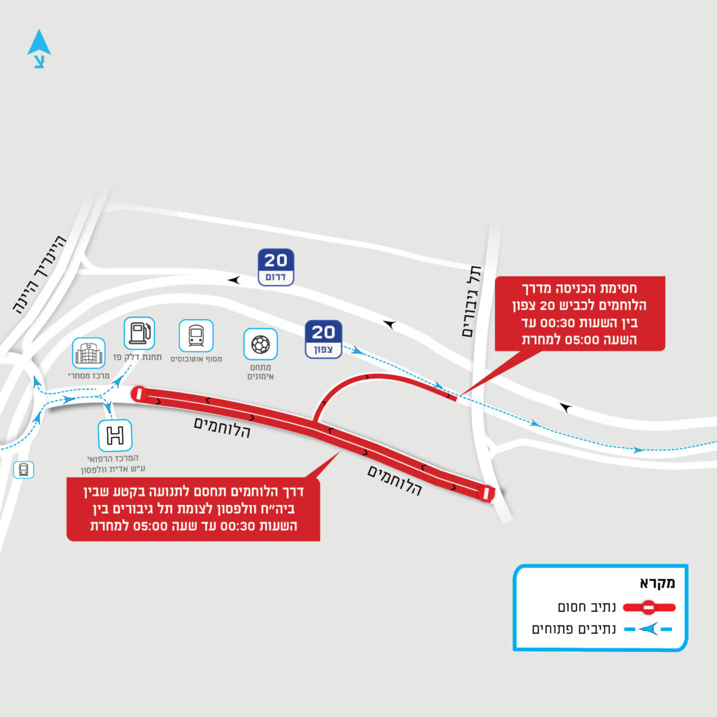 - שימו לב: הכניסה מכיוון דרך הלוחמים לכביש 20 צפון תיחסם בשעות אלו.