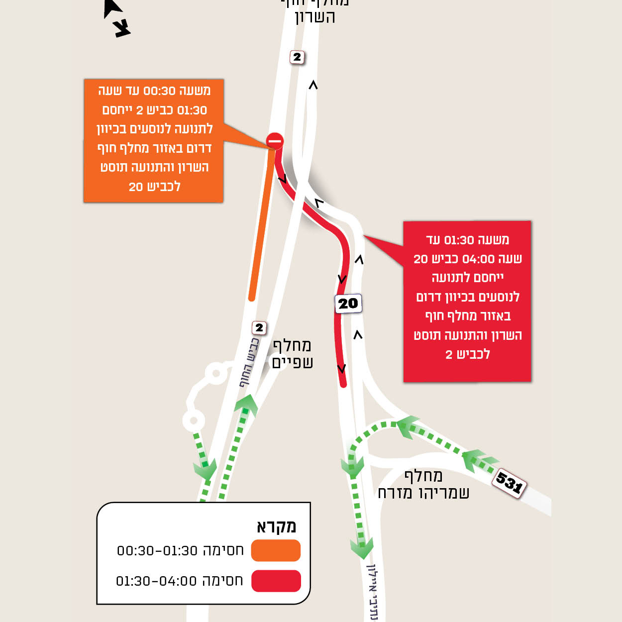 - 01:30 עד 04:00: כביש 20 ייחסם, והתנועה תוסט לכביש 2.