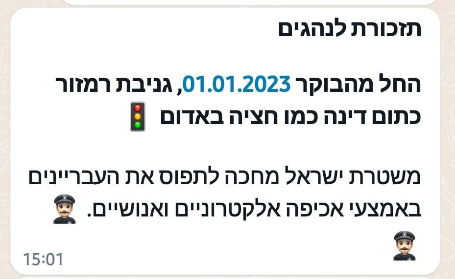 משעות הבוקר מופצת הודעת ווצאפ – תזכורת לנהגים בכל קבוצות הווצאפ הקיימות במדינה, לפיה החל מהיום 01.01.2023, גניבת רמזור כתום דינה כמו חציה באדום. משטרת ישראל מחכה לתפוס את העבריינים באמצעי אכיפה אלקטרוניים ואנושיים. שימו לב‼️‼️".