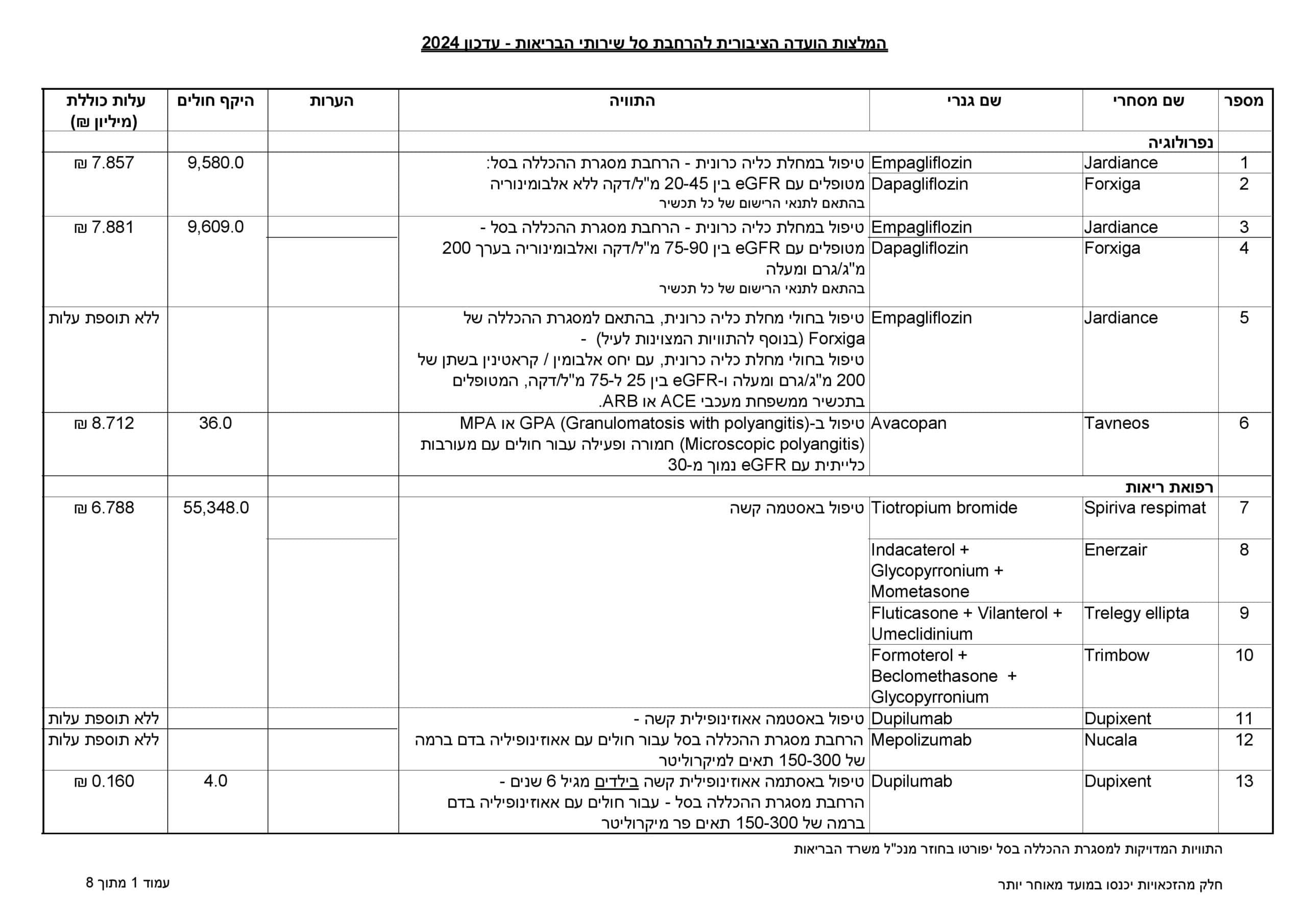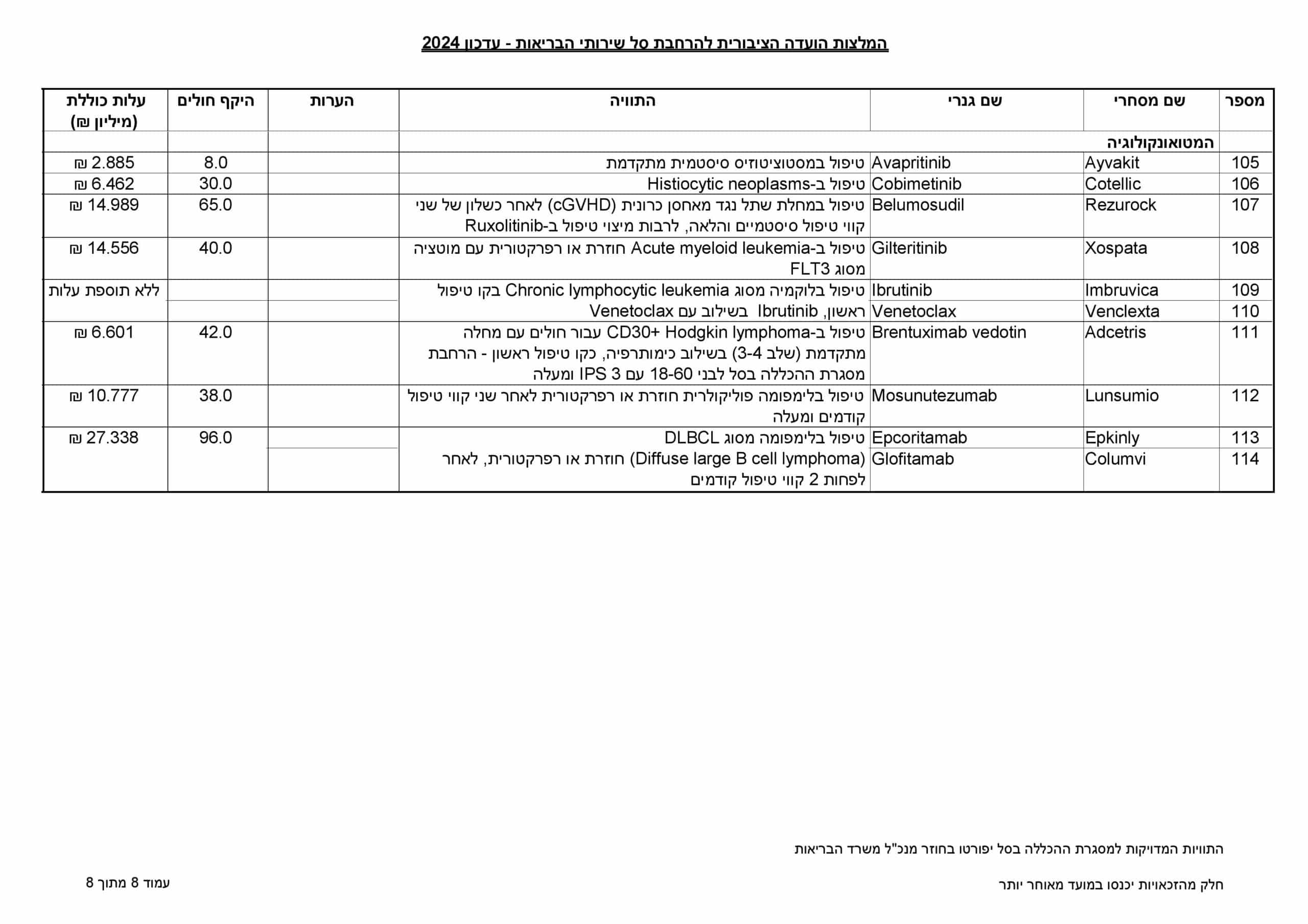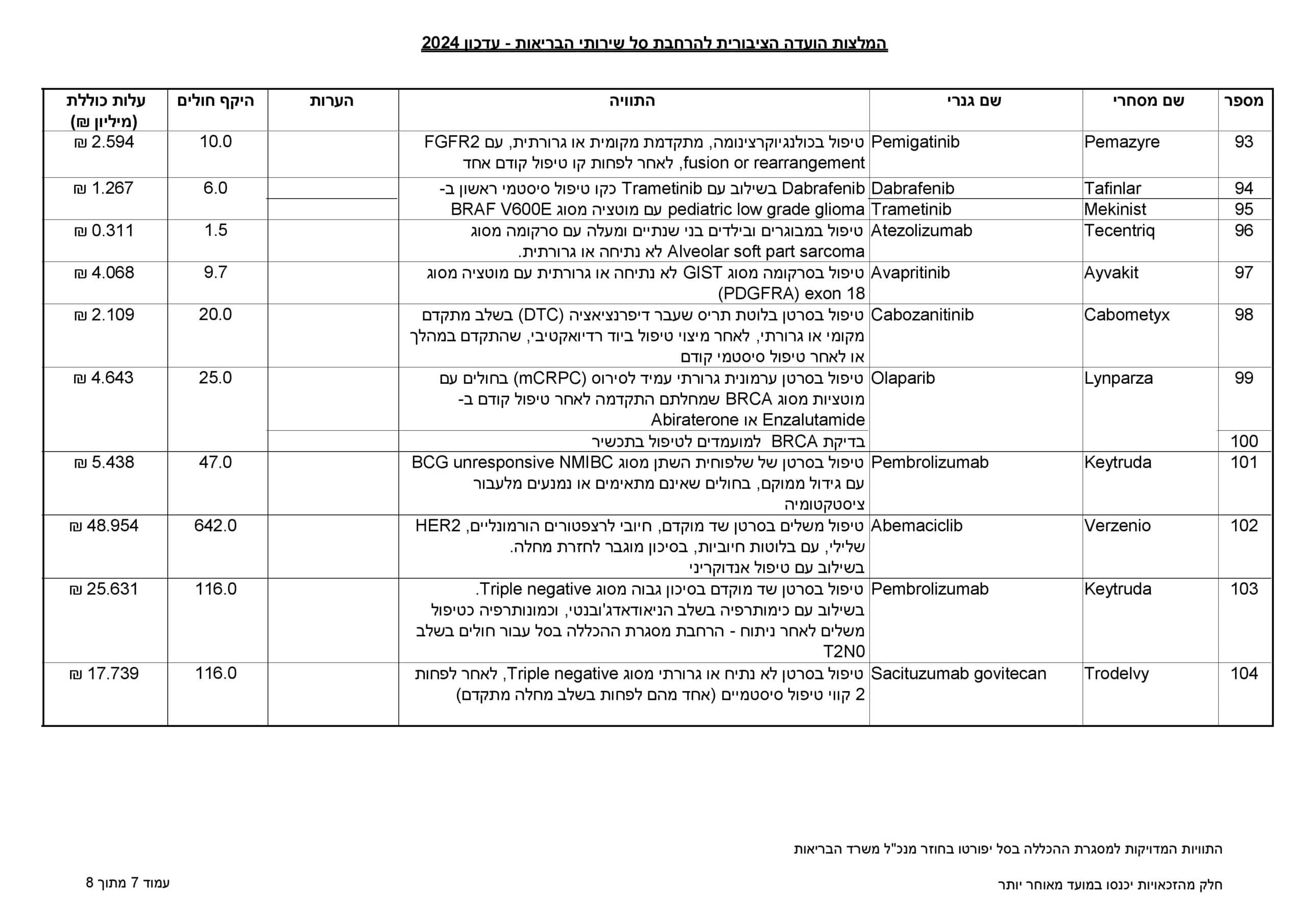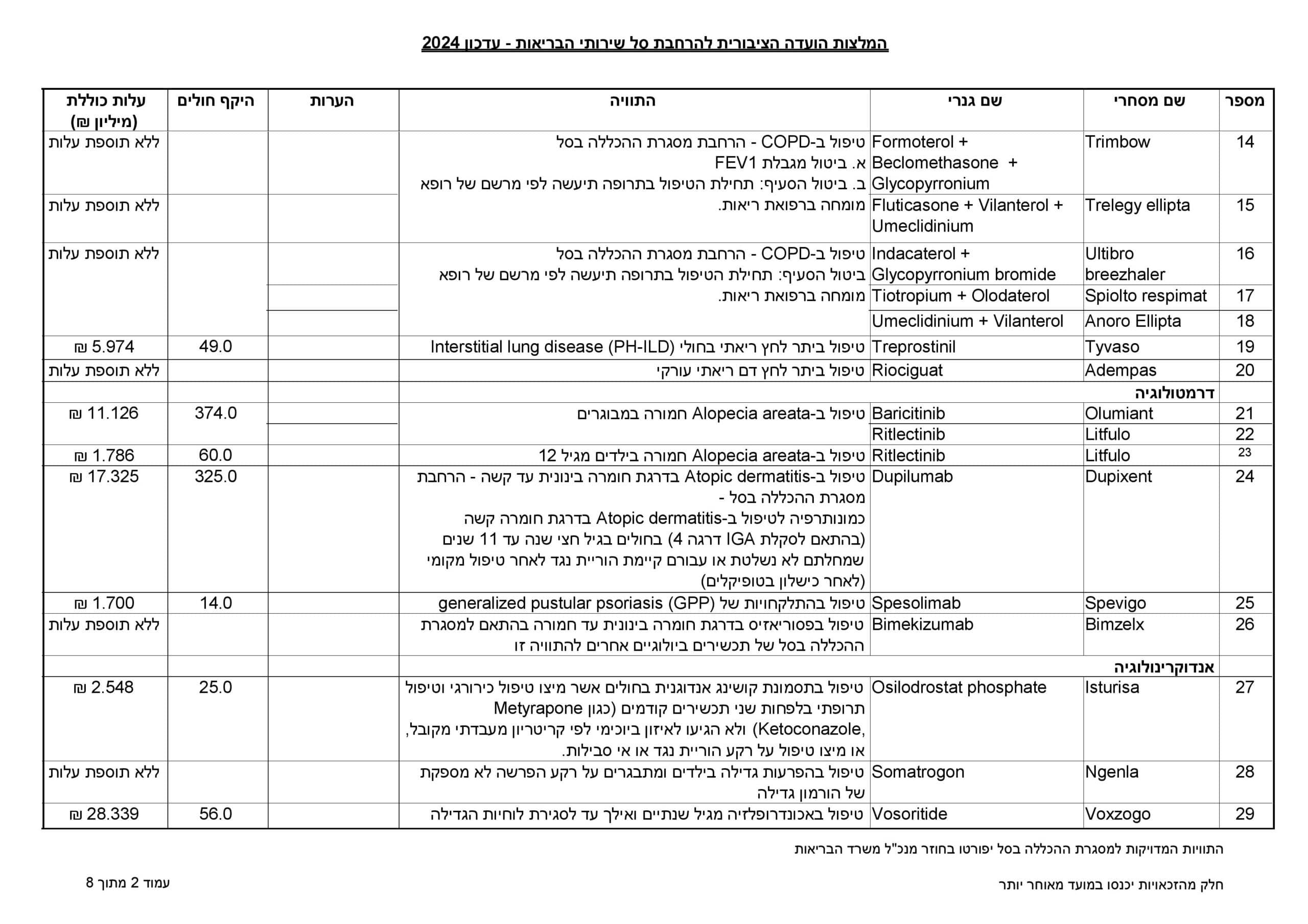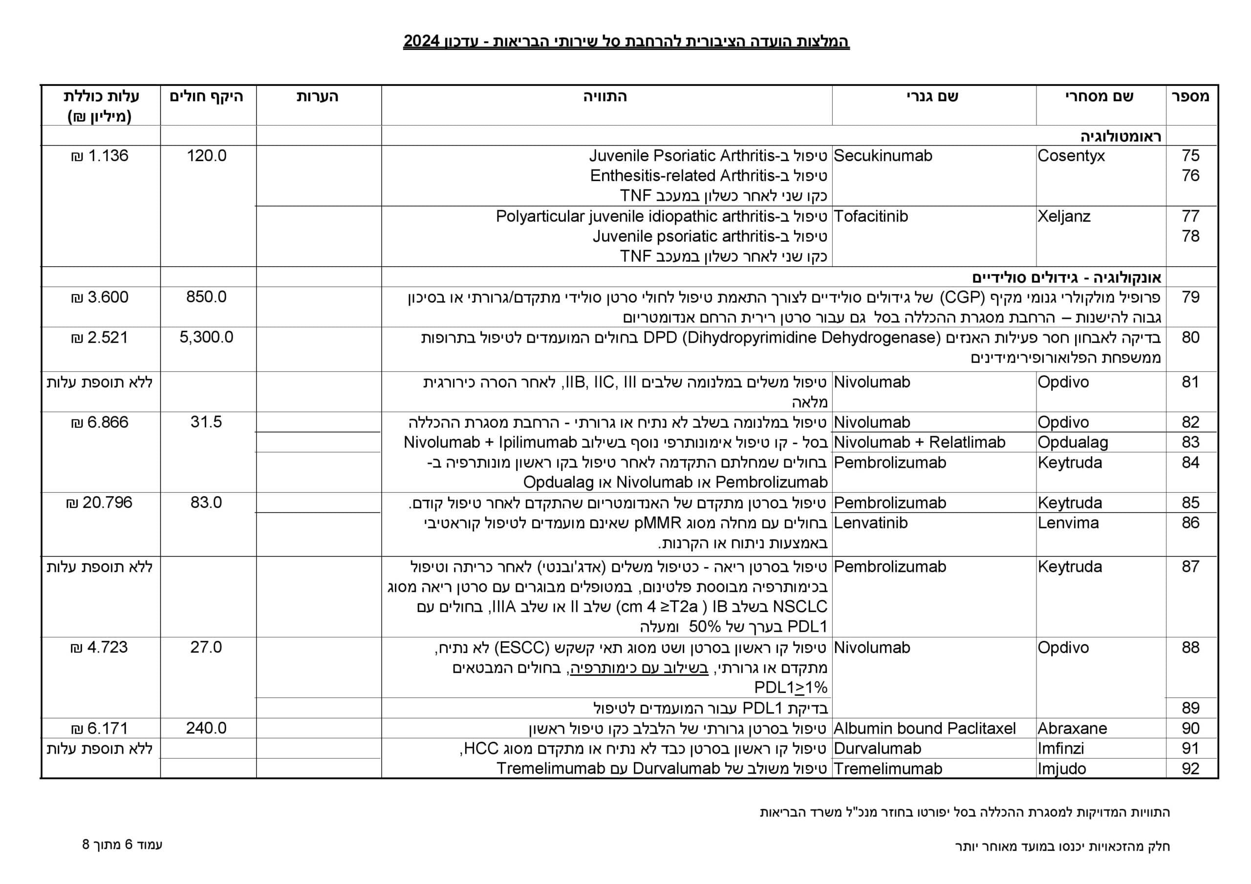 הוועדה הציבורית להרחבת סל שירותי הבריאות לשנת 2024 סיימה את דיוניה והגישה את המלצותיה לשר הבריאות הוועדה הציבורית להרחבת סל שירותי הבריאות ממליצה על הכנסת למעלה מ-110 תרופות וטכנולוגיות, בהם טיפולים עבור כ-317 אלף איש בעלות כוללת של 650 מיליון ₪ לשנת 2024.
