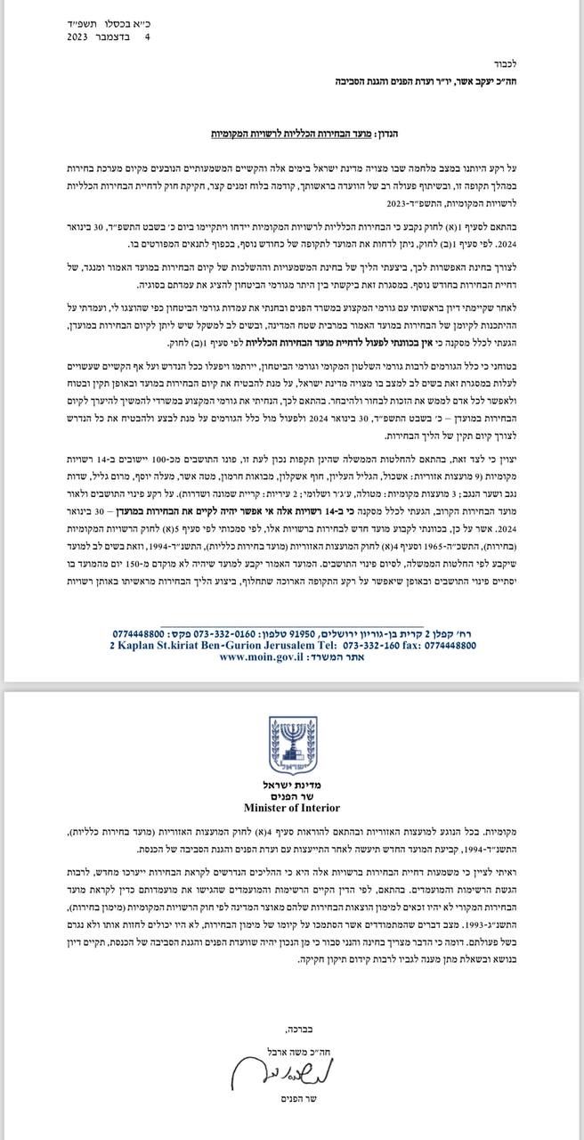 שר הפנים הודיע: הבחירות ברשויות המקומיות יתקיימו ב-30 בינואר, חוץ מ-14 הרשויות שפונו בשל המלחמה. ביישוב שפונה יתקיימו הבחירות רק חמישה חודשים אחרי שיחזרו התושבים.
