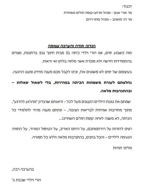 "מזה כשבוע ימים, אנו הורי וילדי כיתה ב3 מבית חינוך נבון ברחובות, מצויים בהתמודדות חדשה ולא מוכרת אשר מלווה בלחץ ואי ודאות", צוין במכתב. "בעיצומם של ימים לא פשוטים אלו, זכינו לקבל מכם מענה מדויק ומעט הרגעה. נחלצתם לעזרת משפחות הכיתה במהירות, בלי לשאול שאלות – ובהתנדבות מלאה. שמתם את טובת הילדים הקטנים מעל לכל – ודאגתם שניבדק "מהרגע להרגע", מתוך מחוייבות אמיתית לבריאות הציבור – ונתתם מענה מהיר לתלמידי כל הכיתה, לא משנה לאיזה קופת חולים השתייכו… רצינו להודות על הירתמותכם, על היחס האדיב, על הטיפול המהיר, על החוויה הנעימה לילדים – והכל בחינם, בהתנדבות מלאה וללא כל תמורה. מיליוני תודות".