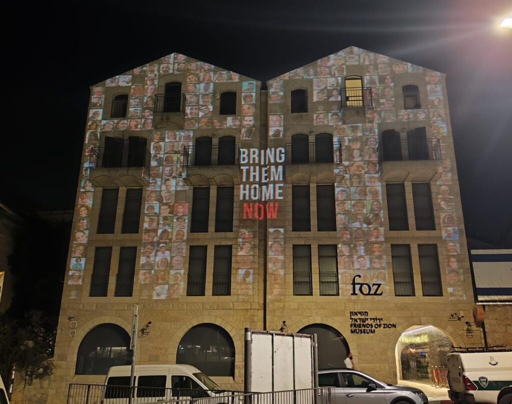 מהערב מוקרנות על בנין מוזיאון ידידי ישראל בירושלים תמונות ושמות החטופים והנעדרים עם הקריאה להחזירם הביתה עכשיו וגם משודר בשידור חי.