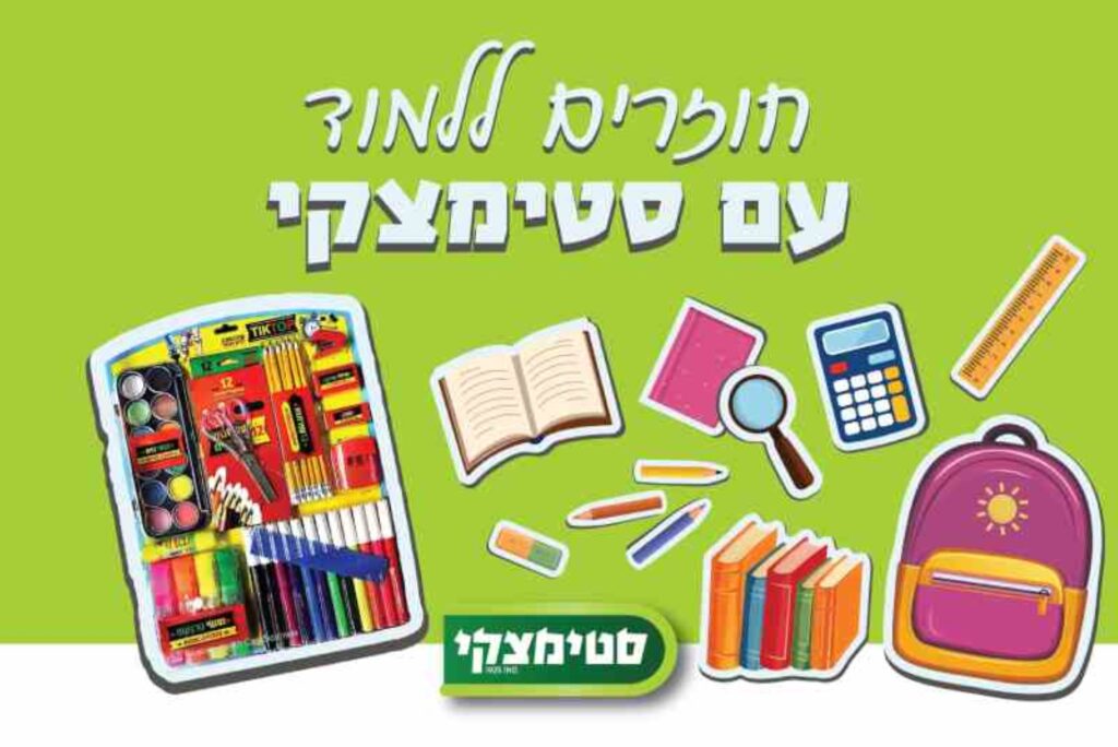 - ערכת חזרה לבית הספר מבית סטימצקי – כוללת שדכן, עפרונות, צבעים, טושים, מחדד, דבק, מספריים, צבעי מים, סרגל ועוד – ב־19 ₪ בלבד (במקום 39 ₪)