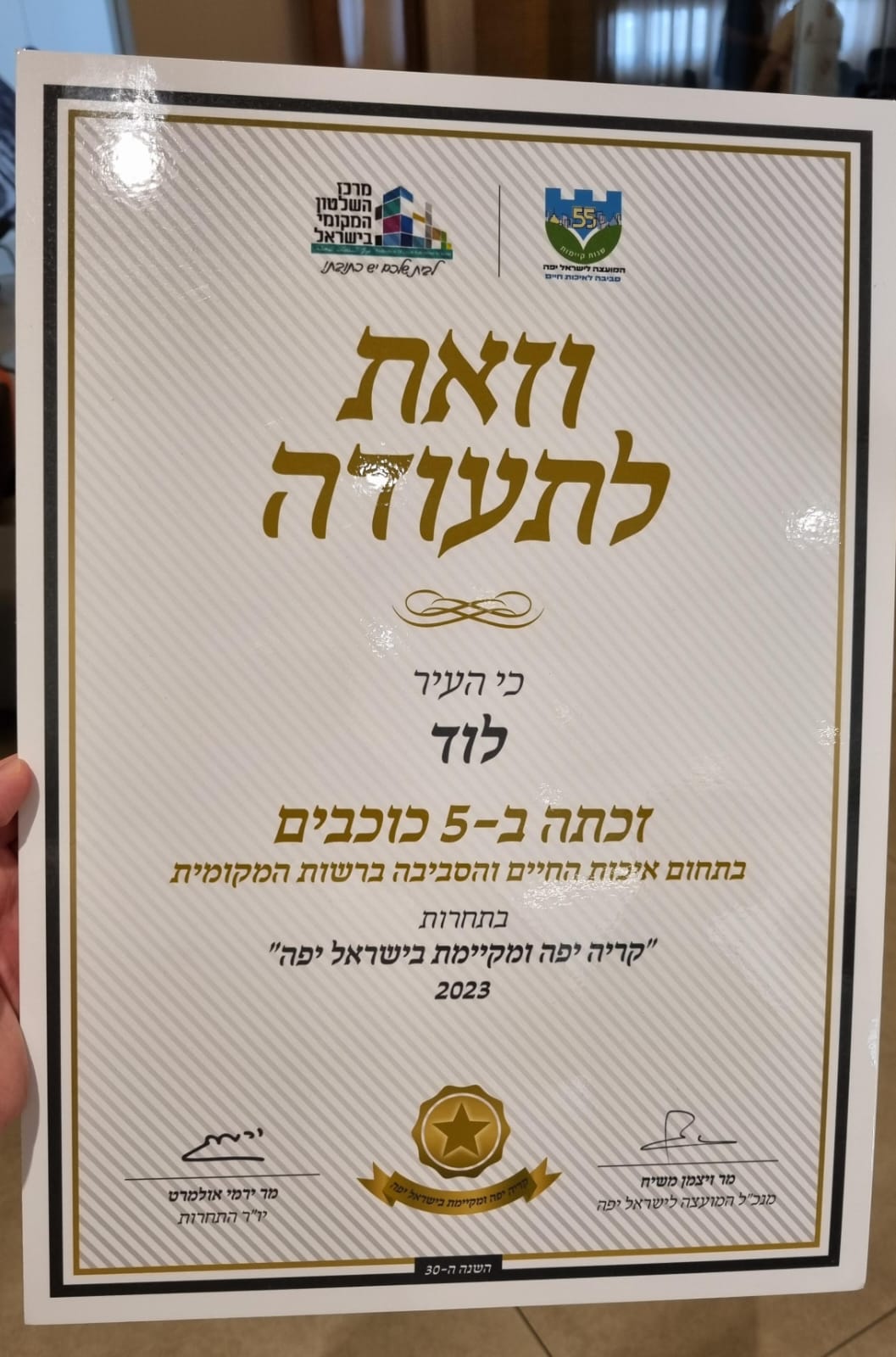 עיריית לוד והעיר לוד זכו בתעודת הוקרה ו-5 כוכבי יופי בטקס גמר התחרות של 'המועצה לישראל היפה' שנערך בתל אביב, לאחר מאמץ רב של הרשות המקומית, אגפיה ועובדיה המסורים. במסגרת התחרות השנתית שעורכת המועצה היא עוברת בין כלל הערים בישראל, ולפיה היא מדרגת אותם בכוכבי יופי.