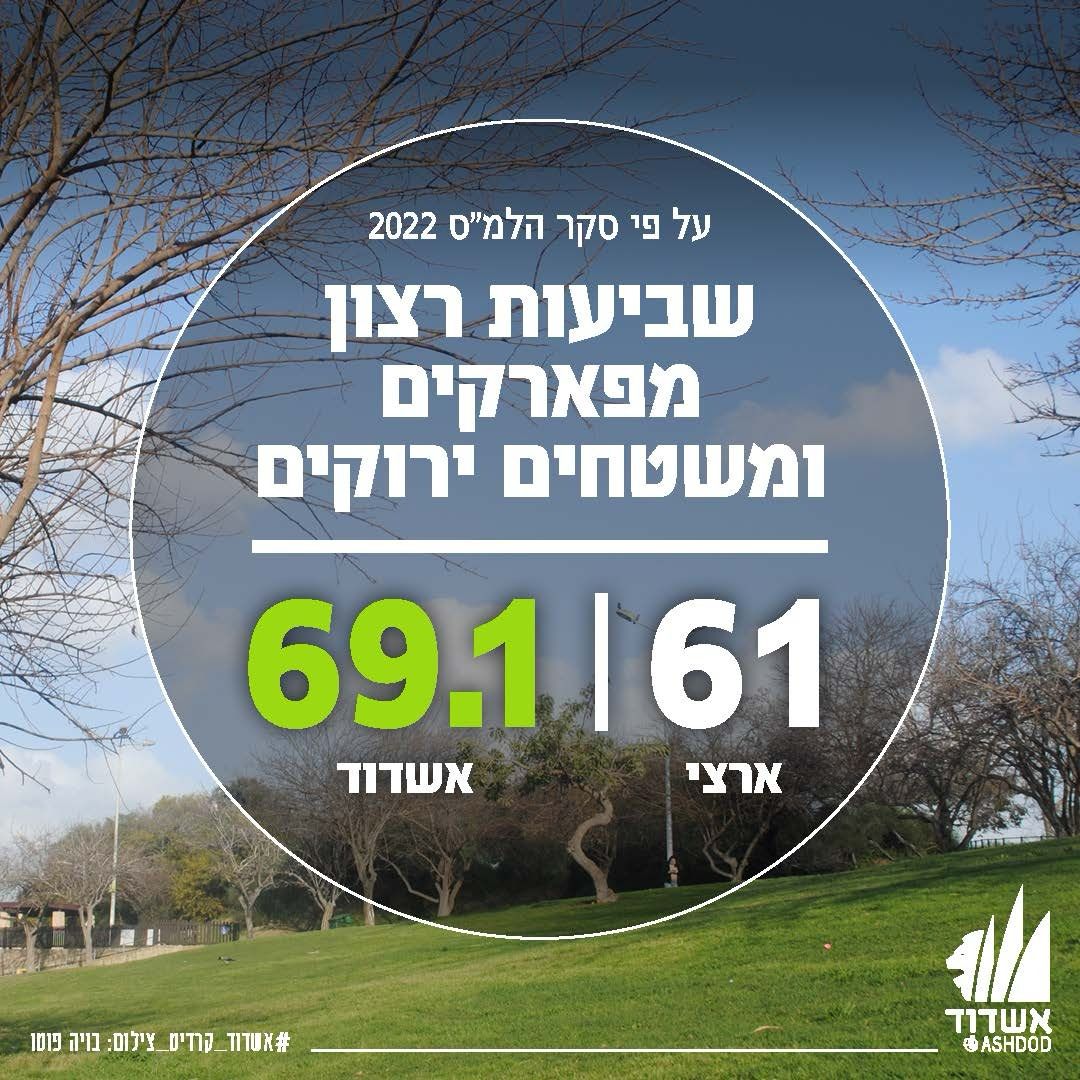 על פי דו"ח הלשכה המרכזית לסטטיסטיקה תושבי אשדוד מרוצים מפארקים ושטחים ירוקים ושבעי רצון מאזור המגורים שלהם.