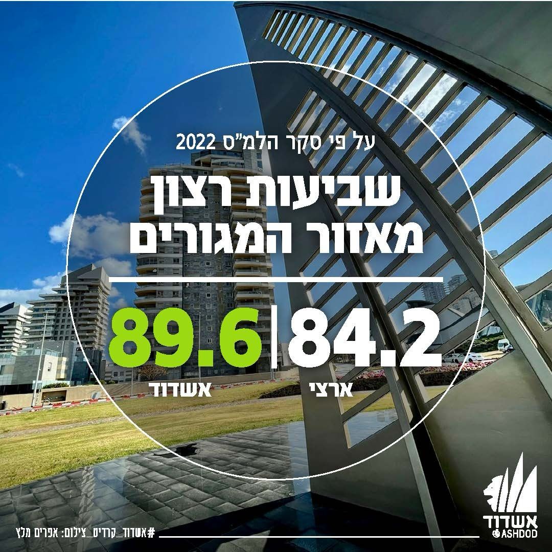 הקמת הפארקים, העצמת אירועי התרבות, הטיפוח הסביבתי, שדרוג המרחב האישי-ציבורי, והגברת הביטחון האישי באמצעות מצלמות ותאורה מתקדמת מציבים את אשדוד בצמרת הערים בישראל שתושביהן מרוצים מהן – על פי דו"ח הלשכה המרכזית לסטטיסטיקה לשנת 2022. מדובר בעלייה לעומת השנה שעברה, ונתונים גבוהים מממוצע הארצי העומד על 84%.