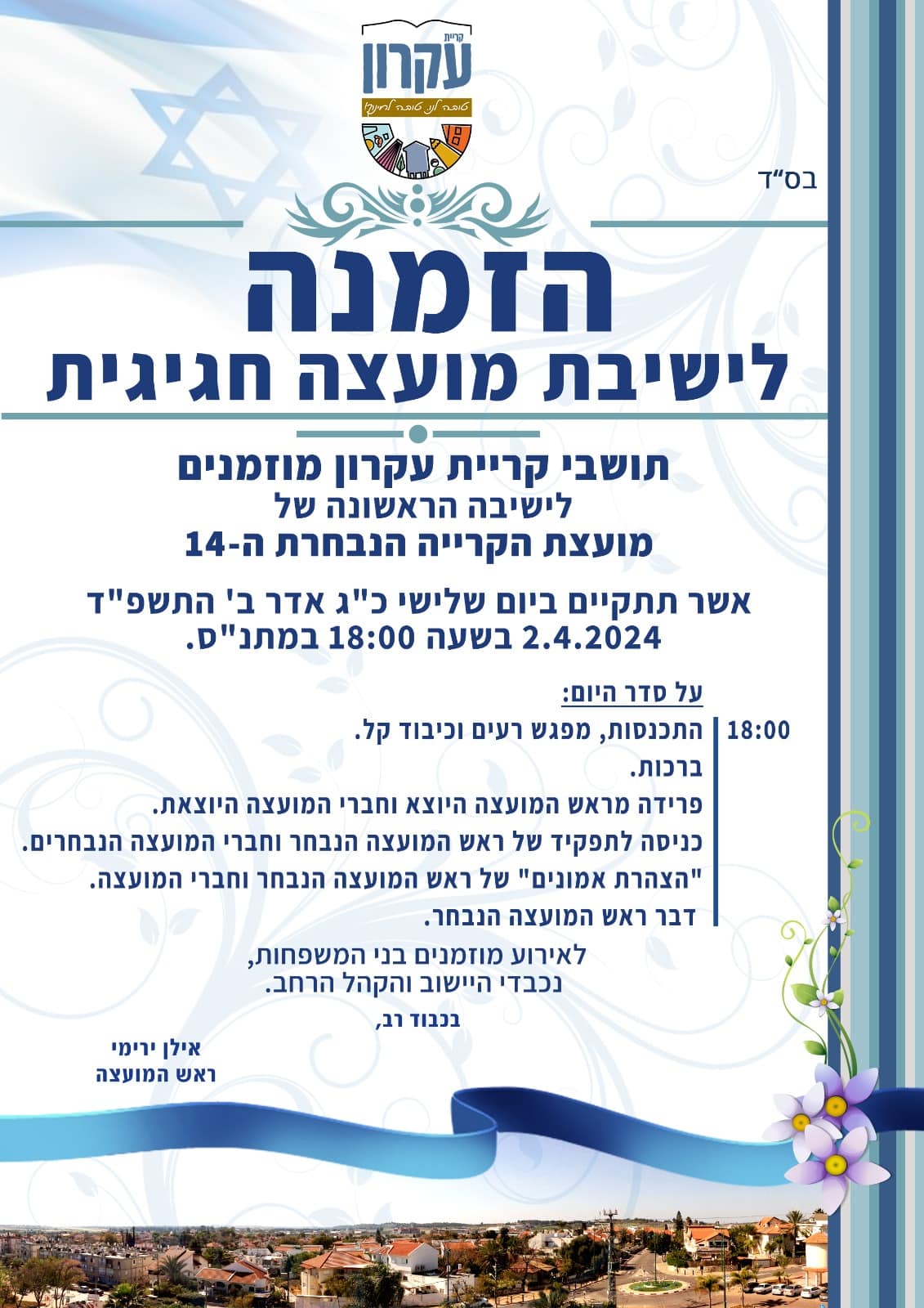 תושבות ותושבי קריית עקרון מוזמנים לישיבה הראשונה של מועצת הקרייה הנבחרת ה-14, אשר תתקיים ביום שלישי הקרוב, 2.4.24 בשעה 18:00 במתנ"ס.
