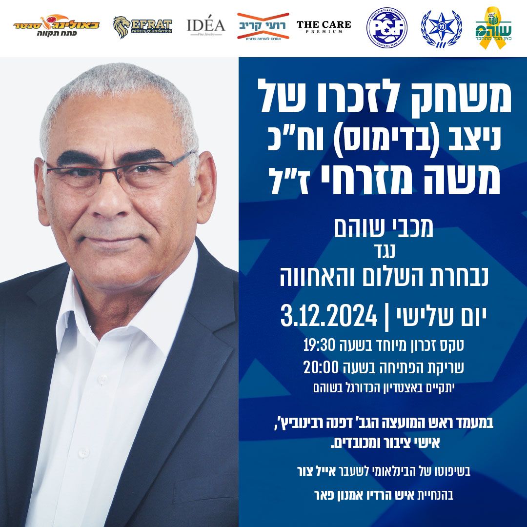 נבחרת השלום והאחווה מגיעה לשוהם כדי להוקיר את זכרו של משה מזרחי, במסגרת משחק מיוחד שתקיים ב-3.12 באצטדיון העירוני מול מכבי המקומית.