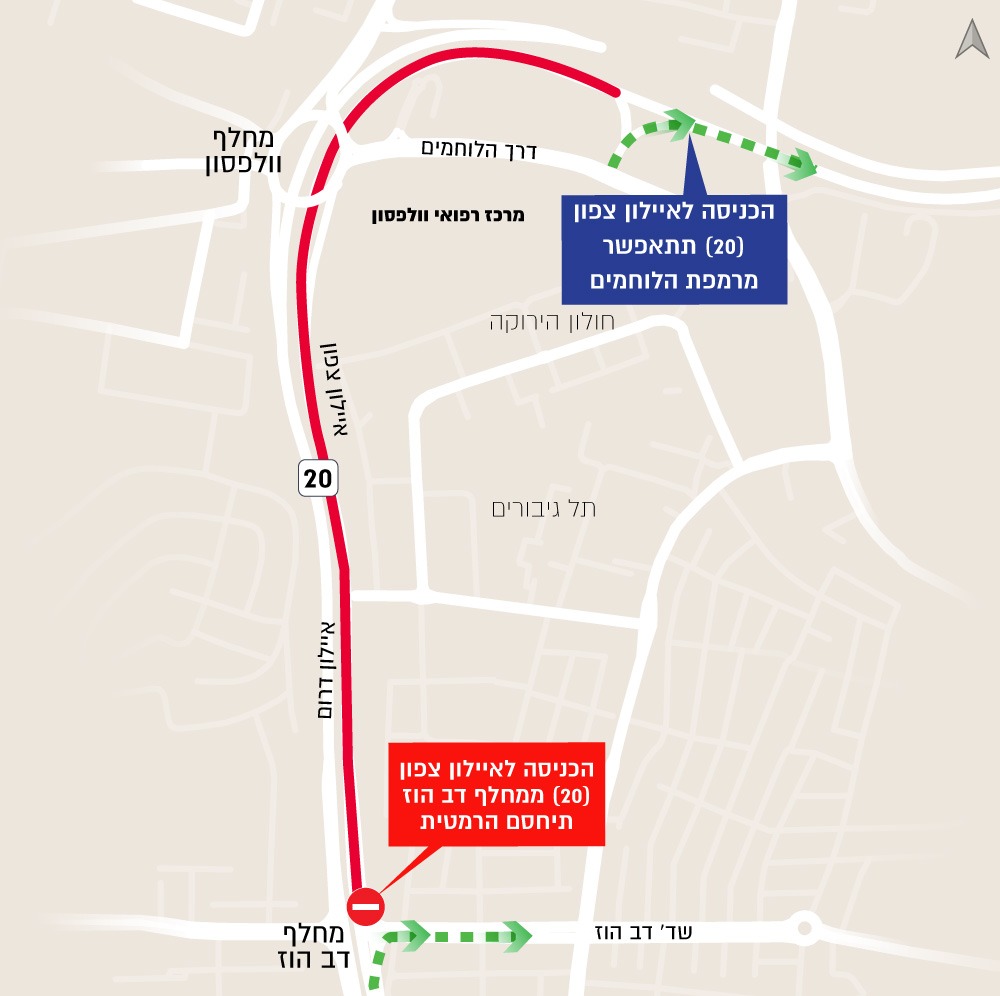 כביש 20 ייחסם לתנועה לנוסעים בכיוון צפון, בקטע שבין מחלף דב הוז למחלף וולפסון. תיחסם הכניסה ממחלף דב הוז לכביש 20 לכיוון צפון, והתנועה תוסט ליציאה מכביש 20 לכיוון צפון במחלף דב הוז- לשדרות דב הוז. הכניסה מדרך הלוחמים בחולון לכביש 20 לכיוון צפון תתאפשר כרגיל.